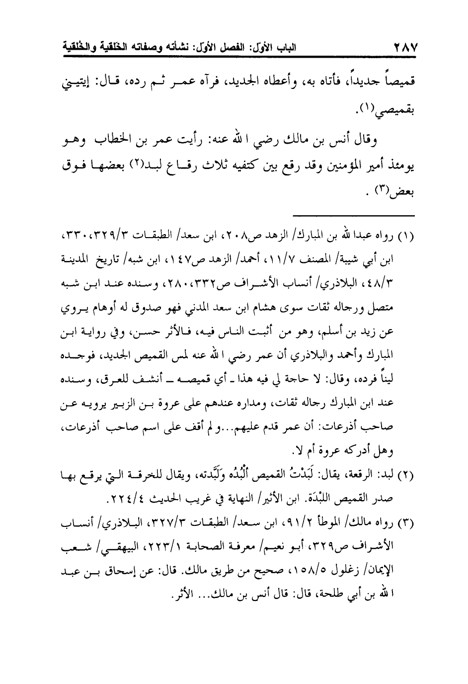 1 رواه عبد الله بن المبارك/ الزهد ص208، ابن سعد/ الطبقات 3/329،330، ابن أبي شيبة/ المصنف 7/11، أحمد/ الزهد ص147، ابن شبه/ تاريخ المدينة 3/48، البلاذري/ أنساب الأشراف ص332،280، وسنده عند ابن شبه متصل ورجاله ثقات سوى هشام ابن سعد المدني فهو صدوق له أوهام يروي عن زيد بن أسلم، وهو من أثبت الناس فيه، فالأثر حسن، وفي رواية ابن المبارك وأحمد والبلاذري أن عمر رضي الله عنه لمس القميص الجديد، فوجده ليناً فرده، وقال: لا حاجة لي فيه هذا - أي قميصه - أنشف للعرق، وسنده عند ابن المبارك رجاله ثقات، ومداره عندهم على عروة بن الزبير يرويه عن صاحب أذرعات: أن عمر قدم عليهم ... ولم أقف على اسم صاحب أذرعات، وهل أدركه عروة أم لا.