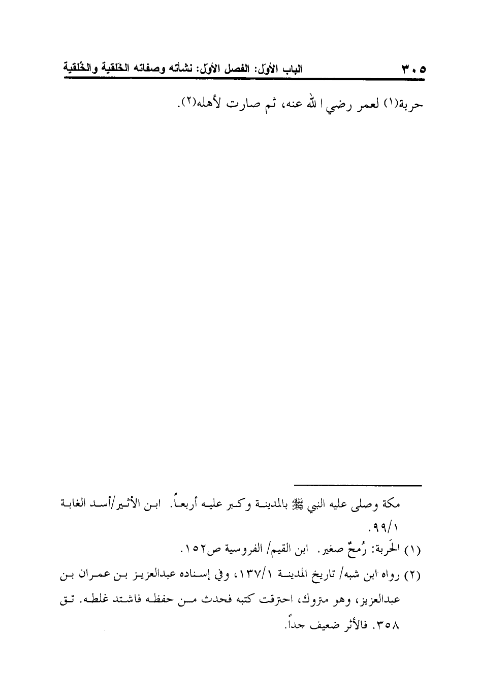 2 رواه ابن شبه/ تاريخ المدينة 1/137، وفي إسناده عبد العزيز بن عمران بن عبد العزيز، وهو متروك، احترقت كتبه فحدث من حفظه فاشتد غلطه. تق 358. فالأثر ضعيف جداً.