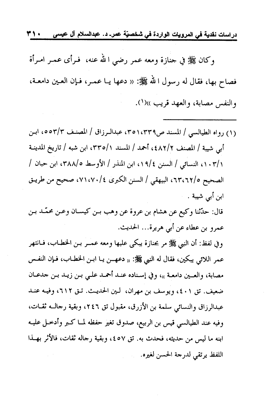وفي لفظ: أن النبي صلى الله عليه وسلم مر بجنازة يبكى عليها ومعه عمر بن الخطاب، فانتهر عمر اللائي يبكين، فقال له النبي صلى الله عليه وسلم: "دعهن يا ابن الخطاب، فإن النفس مصابة، والعين دامعة"، وفي إسناده عند أحمد علي بن زيد بن جدعان ضعيف. تق 401، ويوسف بن مهران، لين الحديث. تق 612، وفيه عند عبد الرزاق والنسائي سلمة بن الأزرق، مقبول تق 246، وبقية رجاله ثقات، وفيه عند الطيالسي قيس بن الربيع، صدوق تغير حفظه لما كبر وأدخل عليه ابنه ما ليس من حديثه، فحدث به. تق 457، وبقية رجاله ثقات، فالأثر بهذا اللفظ يرتقي لدرجة الحسن لغيره.
