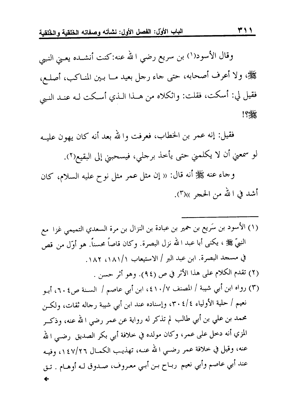 وقال الأسود1 بن سريع رضي الله عنه: كنت أنشده يعني النبي صلى الله عليه وسلم، ولا أعرف أصحابه، حتى جاء رجل بعيد ما بين المناكب، أصلع، فقيل لي: اسكت، فقلت: واثكلاه من هذا الذي أسكت له عند النبي صلى الله عليه وسلم؟!