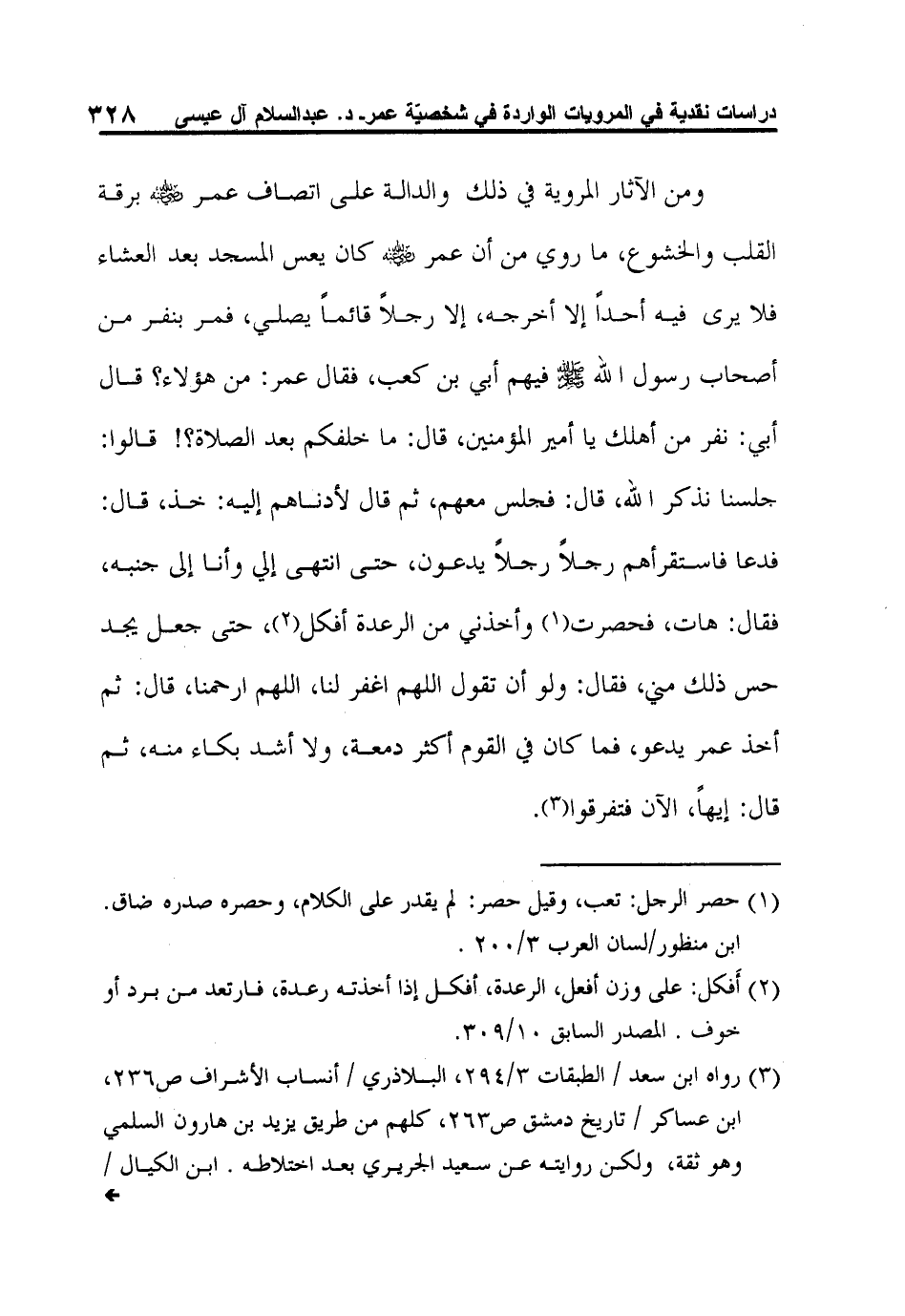 ومن الآثار المروية في ذلك والدالة على اتصاف عمر رضي الله عنه برقة القلب والخشوع، ما روي من أن عمر رضي الله عنه كان يعس المسجد بعد العشاء فلا يرى فيه أحداً إلا أخرجه، إلا رجلاً قائماً يصلي، فمر بنفر من أصحاب رسول الله صلى الله عليه وسلم فيهم أبي بن كعب، فقال عمر: من هؤلاء؟ قال أبي: نفر من أهلك يا أمير المؤمنين، قال: ما خلفكم بعد الصلاة؟! قالوا: جلسنا نذكر الله، قال: فجلس معهم، ثم قال لأدناهم إليه: خذ، قال: فدعا فاستقرأهم رجلاً رجلاً يدعون، حتى انتهى إلي وأنا إلى جنبه، فقال: هات، فحصرت1 وأخذني من الرعدة أفكل2، حتى جعل يجد حس ذلك مني، فقال: ولو أن تقول اللهم اغفر لنا، اللهم ارحمنا، قال: ثم أخذ عمر يدعو، فما كان في القوم أكثر دمعة، ولا أشد بكاء منه، ثم قال: إيهاً، الآن فتفرقوا3.
