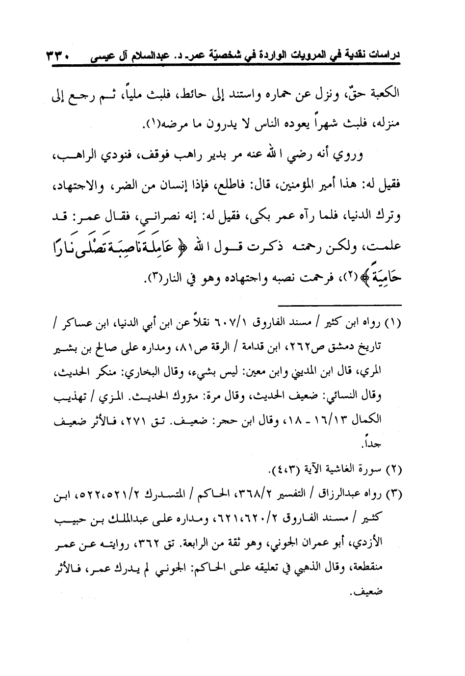 3 رواه عبد الرزاق / التفسير 2/368، الحاكم / المتسدرك 2/521،522، ابن كثير / مسند الفاروق 2/620،621، ومداره على عبد الملك بن حبيب الأزدي، أبو عمران الجوني، وهو ثقة من الرابعة. تق 362، روايته عن عمر منقطعة، وقال الذهبي في تعليقه على الحاكم: الجوني لم يدرك عمر، فالأثر ضعيف.