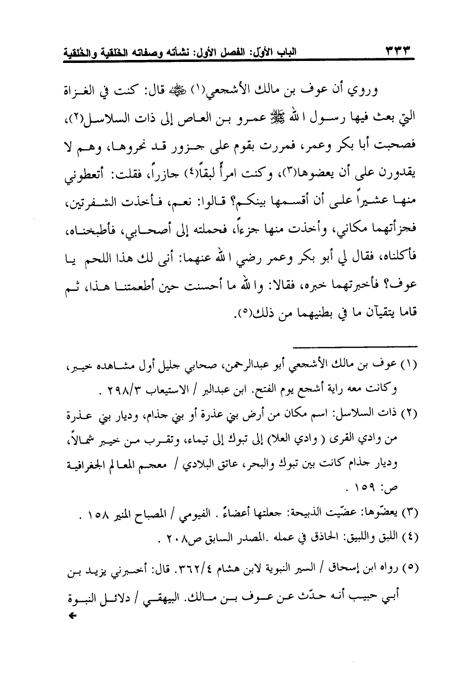 5 رواه ابن إسحاق / السير النبوية لابن هشام 4/362. قال: أخبرني يزيد بن أبي حبيب أنه حدّث عن عوف بن مالك. البيهقي / دلائل النبوة 4/404،405، ومداره على يزيد بن أبي حبيب وهو ثقة من الخامسة، روايته عن عوف الأشجعي معضلة وبقية رجاله عند ابن إسحاق ثقات، فالأثر ضعيف.
