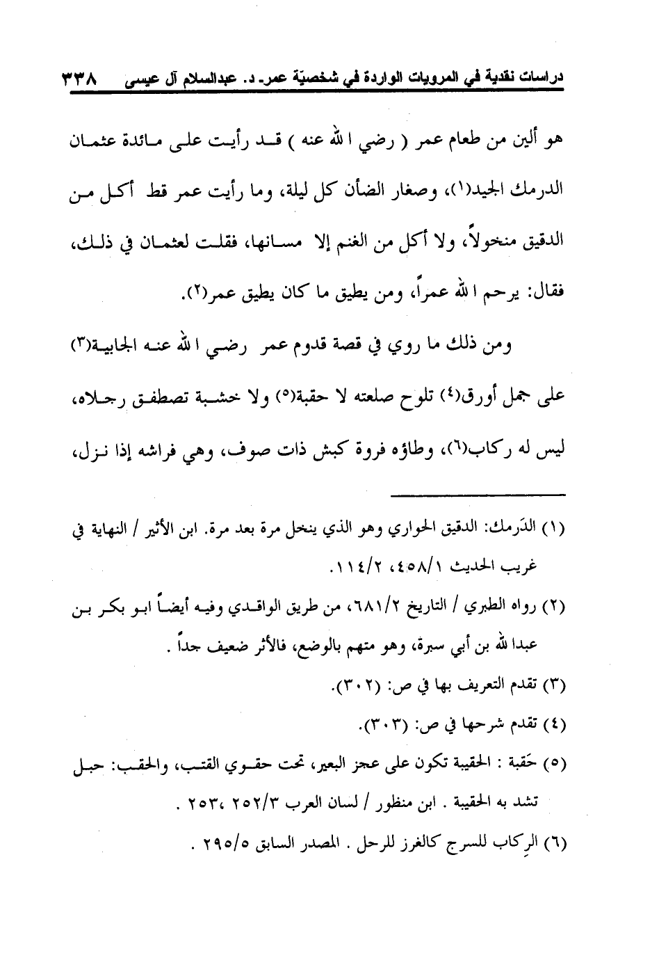 ومن ذلك ما روي في قصة قدوم عمر رضي الله عنه الجابية3 على جمل أورق4 تلوح صلعته لا حقبة5 ولا خشبة تصطفق رجلاه، ليس له ركاب6، وطاؤه فروة كبش ذات صوف، وهي فراشه إذا نزل،