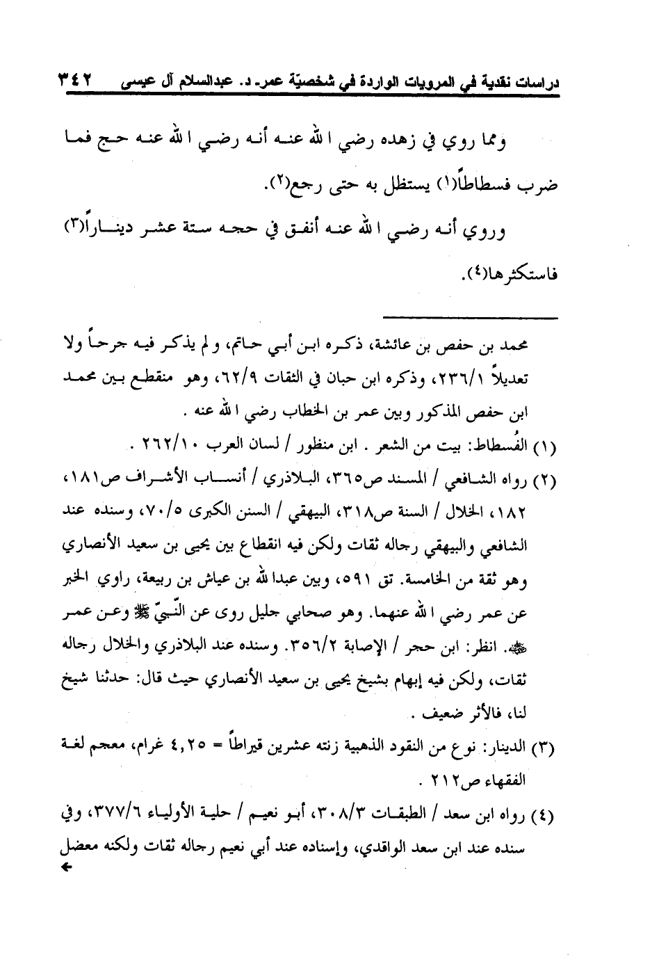 2 رواه الشافعي / المسند ص365، البلاذري / أنساب الأشراف ص181، 182، الخلال / السنة ص318، البيهقي / السنن الكبرى 5/70، وسنده عند الشافعي والبيهقي رجاله ثقات ولكن فيه انقطاع بين يحيى بن سعيد الأنصاري وهو ثقة من الخامسة. تق 591، وبين عبد الله بن عياش بن ربيعة، راوي الخبر عن عمر رضي الله عنهما. وهو صحابي جليل روى عن النّبيّ صلى الله عليه وسلم وعن عمر رضي الله عنه. انظر: ابن حجر / الإصابة 2/356. وسنده عند البلاذري والخلال رجاله ثقات، ولكن فيه إبهام بشيخ يحيى بن سعيد الأنصاري حيث قال: حدثنا شيخ لنا، فالأثر ضعيف.