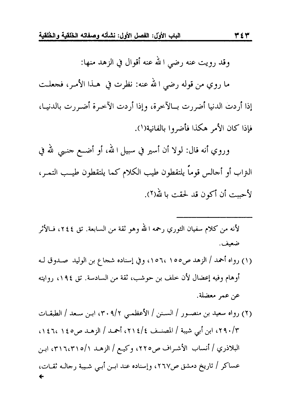 2 رواه سعيد بن منصور / السنن / الأعظمي 2/309، ابن سعد / الطبقات 3/290، ابن أبي شيبة / المصنف 4/214، أحمد / الزهد ص145،146، البلاذري / أنساب الأشراف ص225، وكيع / الزهد 1/315،316، ابن عساكر / تاريخ دمشق ص267، وإسناده عند ابن أبي شيبة رجاله ثقات، لكن مدار الحديث على يحيى بن جعدة المخزومي، وهو ثقة من الثالثة. تق 588، روايته عن عمر منقطعة، فالأثر ضعيف.