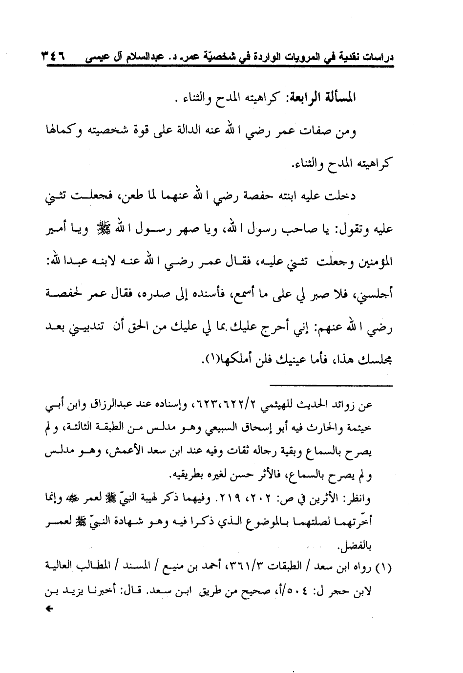 1 رواه ابن سعد / الطبقات 3/361، أحمد بن منيع / المسند / المطالب العالية لابن حجر ل: 504/أ، صحيح من طريق ابن سعد. قال: أخبرنا يزيد بن هارون، قال: أخبرنا حريز بن عثمان، قال: أخبرنا حبيب بن عبد الله الرحبي عن المقدام بن معدي كرب.
