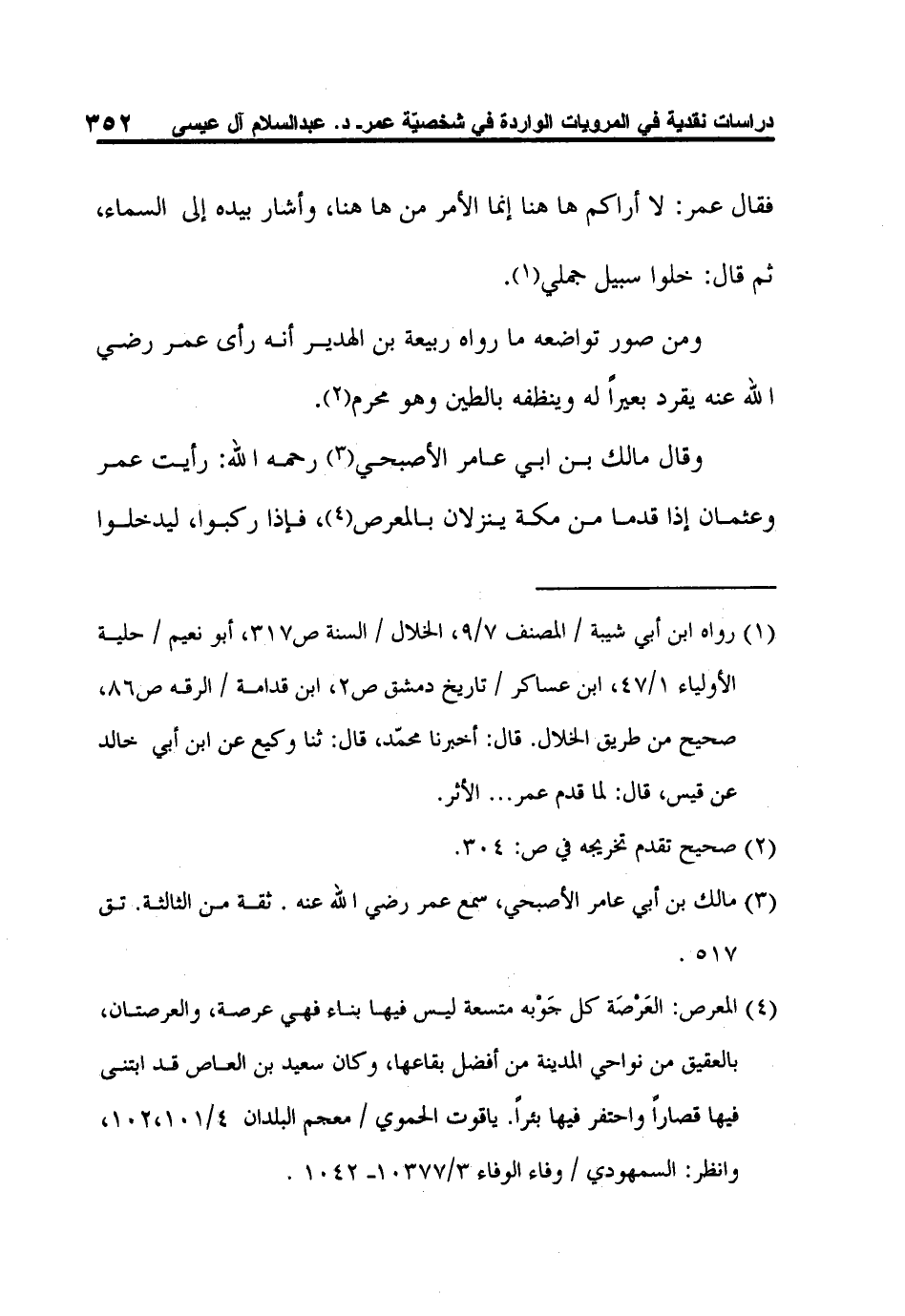 4 المعرص: العَرْصَة كل جَوْبه متسعة ليس فيها بناء فهي عرصة، والعرصتان، بالعقيق من نواحي المدينة من أفضل بقاعها، وكان سعيد بن العاص قد ابتنى فيها قصاراً واحتفر فيها بئراً. ياقوت الحموي / معجم البلدان 4/101،102، وانظر: السمهودي / وفاء الوفاء 3/10377- 1042.