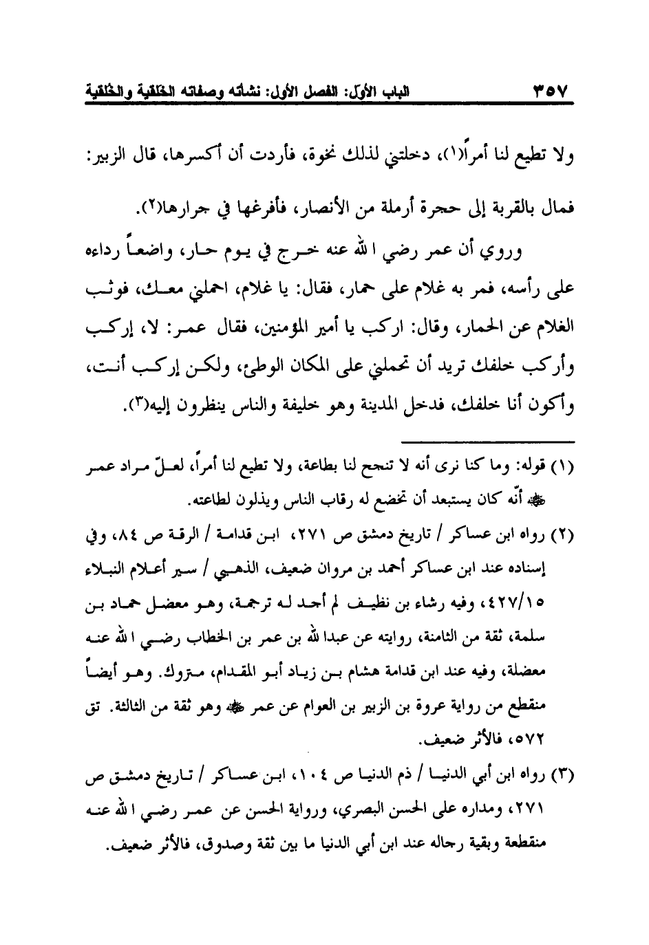 2 رواه ابن عساكر / تاريخ دمشق ص 271، ابن قدامة / الرقة ص 84، وفي إسناده عند ابن عساكر أحمد بن مروان ضعيف، الذهبي / سير أعلام النبلاء 15/427، وفيه رشاء بن نظيف لم أجد له ترجمة، وهو معضل حماد بن سلمة، ثقة من الثامنة، روايته عن عبد الله بن عمر بن الخطاب رضي الله عنه معضلة، وفيه عند ابن قدامة هشام بن زياد أبو المقدام، متروك. وهو أيضاً منقطع من رواية عروة بن الزبير بن العوام عن عمر رضي الله عنه وهو ثقة من الثالثة. تق 572، فالأثر ضعيف.