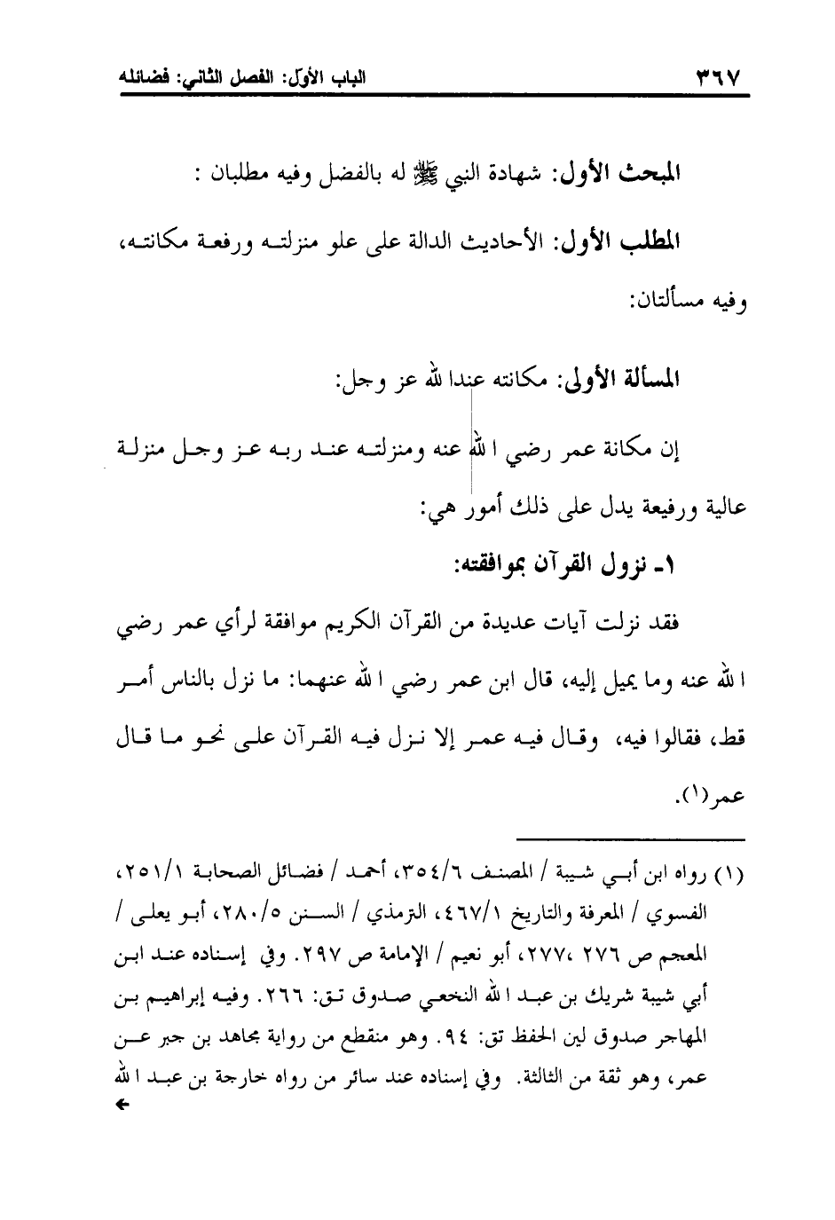 1 رواه ابن أبي شيبة / المصنف 6/354، أحمد / فضائل الصحابة 1/251، الفسوي / المعرفة والتاريخ 1/467، الترمذي / السنن 5/280، أبو يعلى / المعجم ص 276،277، أبو نعيم / الإمامة ص 297. وفي إسناده عند ابن أبي شيبة شريك بن عبد الله النخعي صدوق تق: 266. وفيه إبراهيم بن المهاجر صدوق لين الحفظ تق: 94. وهو منقطع من رواية مجاهد بن جبر عن عمر، وهو ثقة من الثالثة. وفي إسناده عند سائر من رواه خارجة بن عبد الله الأنصاري وهو صدوق له أوهام. تق: 186. وبقية رجاله عند الترمذي وأحمد ثقات. وقد صحّح الأثر الشيخ الألباني في صحيح سنن الترمذي 3/204.