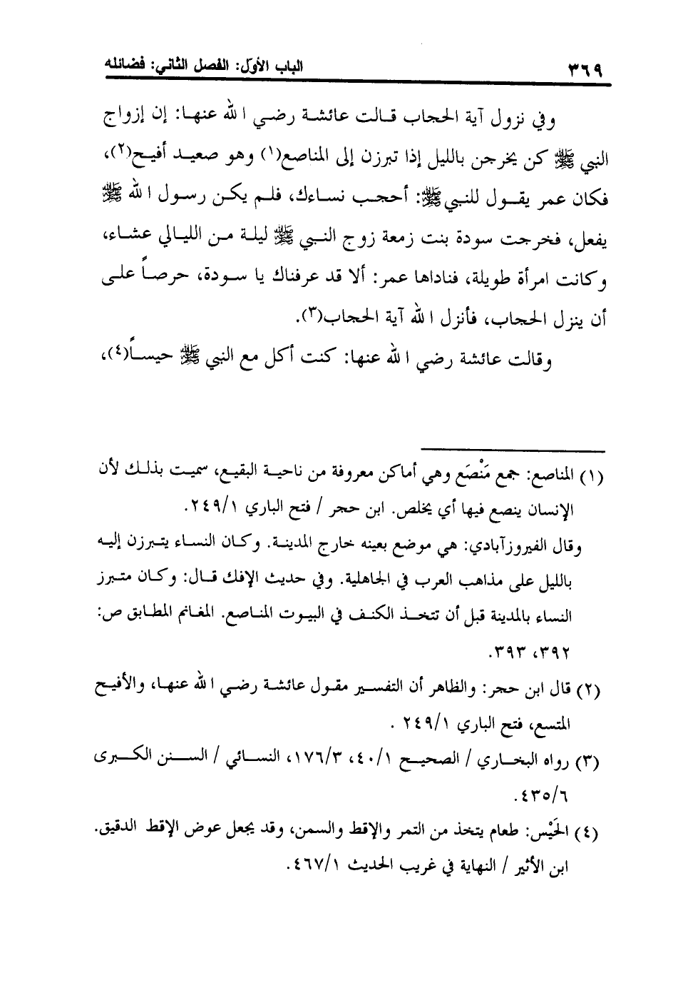 1 المناصع: جمع مَنْصَع وهي أماكن معروفة من ناحية البقيع، سميت بذلك لأن الإنسان ينصع فيها أي يخلص. ابن حجر / فتح الباري 1/249.