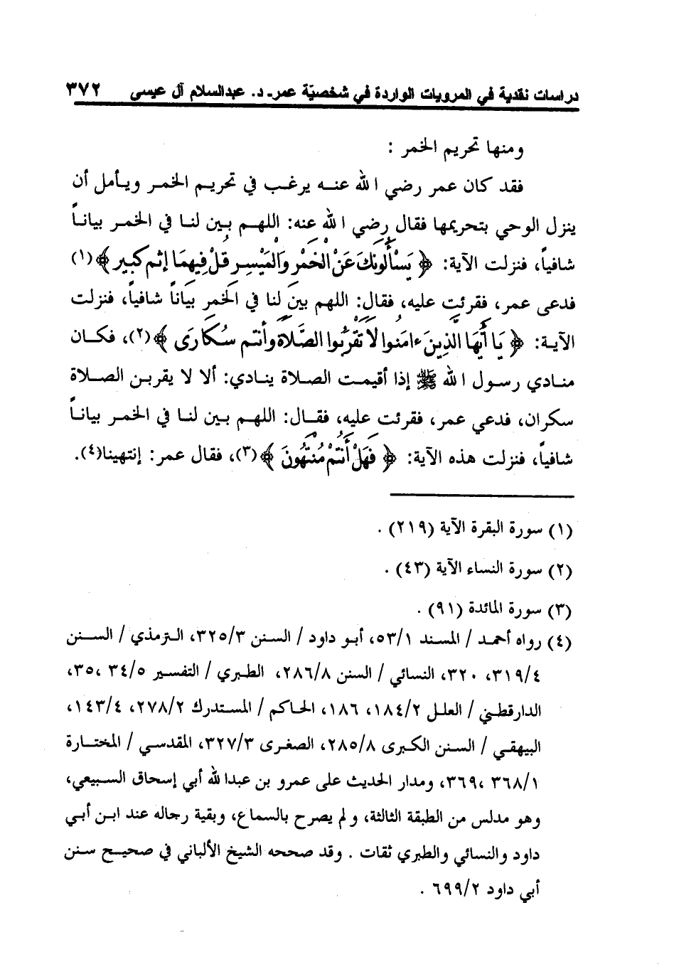 4 رواه أحمد / المسند 1/53، أبو داود / السنن 3/325، الترمذي / السنن 4/319، 320، النسائي / السنن 8/286، الطبري / التفسير 5/34،35، الدارقطني / العلل 2/184، 186، الحاكم / المستدرك 2/278، 4/143، البيهقي / السنن الكبرى 8/285، الصغرى 3/327، المقدسي / المختارة 1/368،369، ومدار الحديث على عمرو بن عبد الله أبي إسحاق السبيعي، وهو مدلس من الطبقة الثالثة، ولم يصرح بالسماع، وبقية رجاله عند ابن أبي داود والنسائي والطبري ثقات. وقد صححه الشيخ الألباني في صحيح سنن أبي داود 2/699.