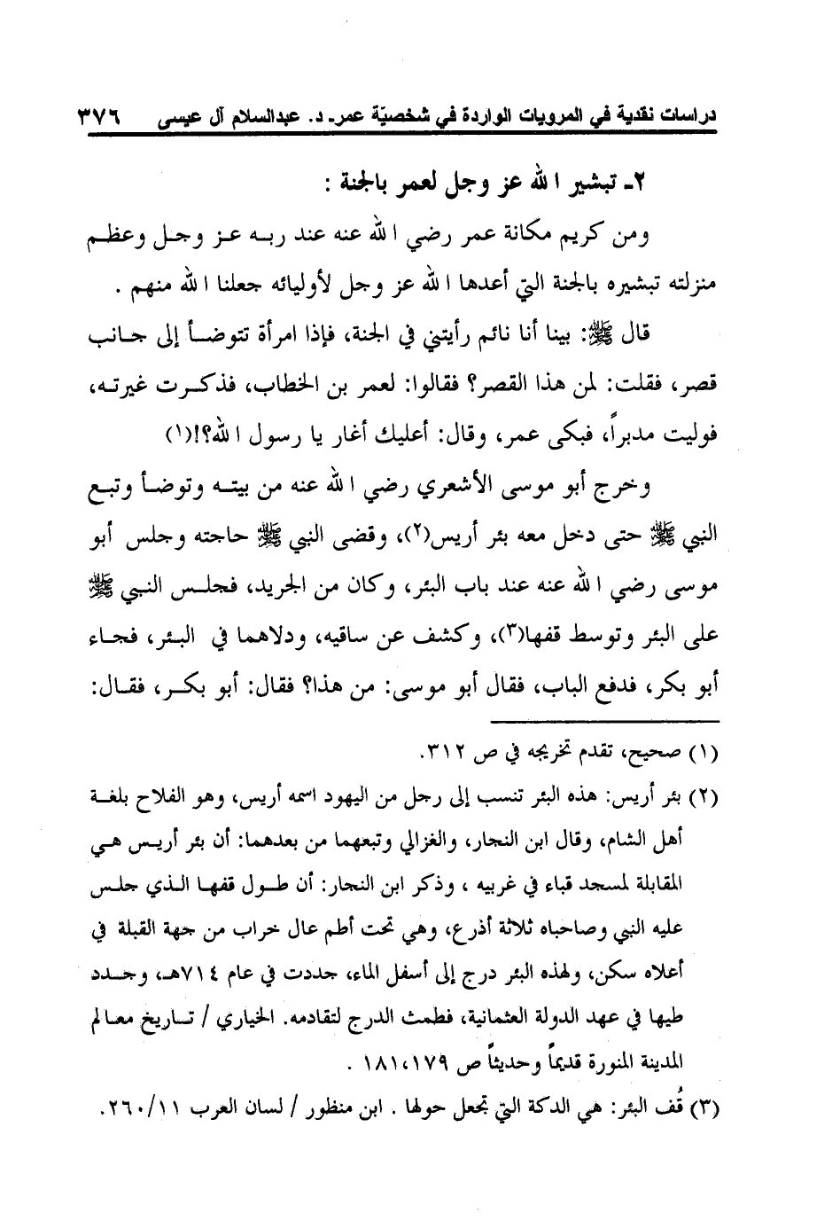 وخرج أبو موسى الأشعري رضي الله عنه من بيته وتوضأ وتبع النبي صلى الله عليه وسلم حتى دخل معه بئر أريس2، وقضى النبي صلى الله عليه وسلم حاجته وجلس أبو موسى رضي الله عنه عند باب البئر، وكان من الجريد، فجلس النبي صلى الله عليه وسلم على البئر وتوسط قفها3، وكشف عن ساقيه، ودلاهما في البئر، فجاء أبو بكر، فدفع الباب، فقال أبو موسى: من هذا؟ فقال: أبو بكر، فقال: