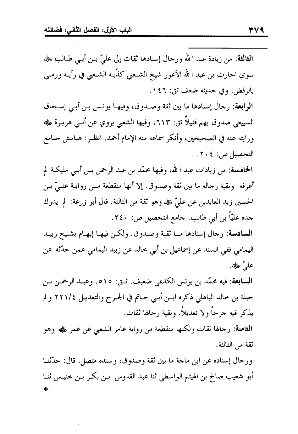 الخامسة: من زيادات عبد الله، وفيها محمّد بن عبد الرحمن بن أبي مليكة لم أعرفه. وبقية رجاله ما بين ثقة وصدوق. إلا أنها منقطعة من رواية عليّ بن الحسين زيد العابدين عن عليّ رضي الله عنه وهو ثقة من الثالثة. قال أبو زرعة: لم يدرك جده عليّاً بن أبي طالب. جامع التحصيل ص: 240.