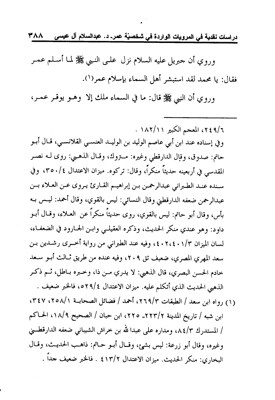 1 رواه ابن سعد / الطبقات 3/269، أحمد / فضائل الصحابة 1/258، 347، ابن شبه / تاريخ المدينة 2/223- 225، ابن حبان / الصحيح 9/18، الحاكم / المستدرك 3/84، ومداره على عبد الله بن خراش الشيباني ضعفه الدارقطني وغيره، وقال أبو زرعة: ليس بشيء، وقال أبو حاتم: ذاهب الحديث، وقال البخاري: منكر الحديث. ميزان الاعتدال 2/413. فالخبر ضعيف جداً.
