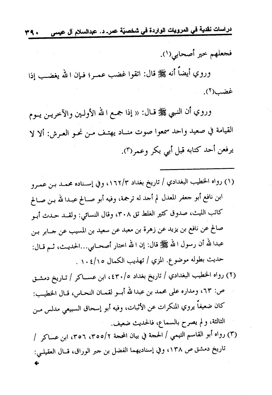 2 رواه الخطيب البغدادي / تاريخ بغداد 5/430، ابن عساكر / تاريخ دمشق ص: 63، ومداره على محمد بن عبد الله أبو لقمان النحاس، قال الخطيب: كان ضعيفاً يروي المنكرات عن الأثبات، وفيه أبو إسحاق السبيعي مدلس من الثالثة، ولم يصرح بالسماع، فالحديث ضعيف.