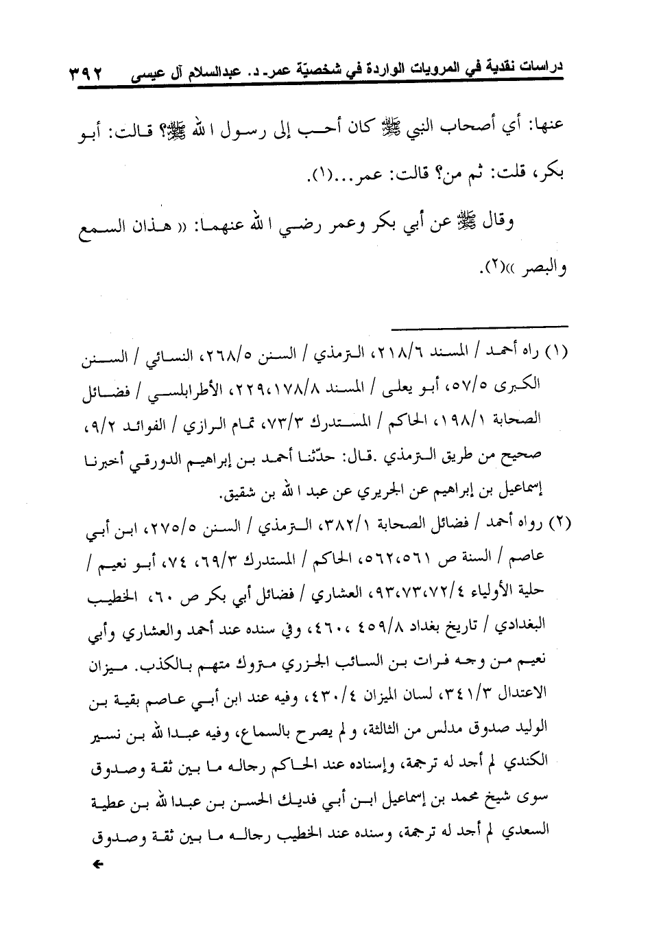 2 رواه أحمد / فضائل الصحابة 1/382، الترمذي / السنن 5/275، ابن أبي عاصم / السنة ص 561،562، الحاكم / المستدرك 3/69، 74، أبو نعيم / حلية الأولياء 4/72،73،93، العشاري / فضائل أبي بكر ص 60، الخطيب البغدادي / تاريخ بغداد 8/459،460، وفي سنده عند أحمد والعشاري وأبي نعيم من وجه فرات بن السائب الجزري متروك متهم بالكذب. ميزان الاعتدال 3/341، لسان الميزان 4/430، وفيه عند ابن أبي عاصم بقية بن الوليد صدوق مدلس من الثالثة، ولم يصرح بالسماع، وفيه عبد الله بن نسير الكندي لم أجد له ترجمة، وإسناده عند الحاكم رجاله ما بين ثقة وصدوق سوى شيخ محمد بن إسماعيل ابن أبي فديك الحسن بن عبد الله بن عطية السعدي لم أجد له ترجمة، وسنده عند الخطيب رجاله ما بين ثقة وصدوق، وعلي بن عبد الرحمن بن عثمان (ذكره ابن أبي حاتم ولم يذكر فيه جرحاً ولا تعديلاً، الجرح والتعديل 6/195) ، فهذا يدل على أن ابن أبي فديك لم يسمعه من عبد العزيز، وقد رواه أحمد بن صالح المصري وآخرون عن ابن أبي فديك هكذا وسموا المبهمين: على بن عبد الرحمن، وعمرو بن أبي عمرو، وأخرجه الحاكم من طريق آدم عن ابن أبي فديك، فسمى الواسطة: الحسن بن عبد الله بن عطية ا. هـ تهذيب الكمال 5/192،193، الإصابة 2/298.