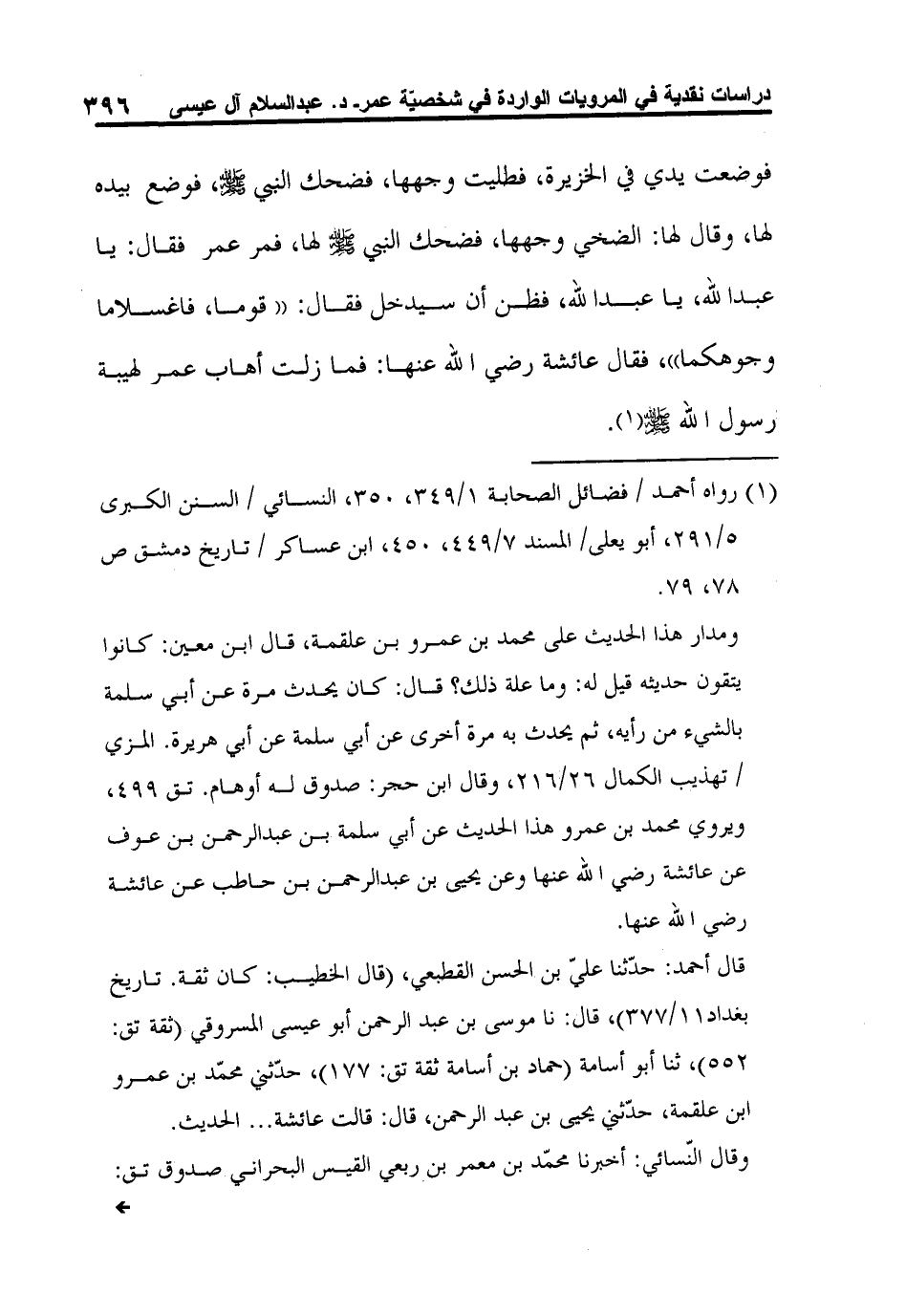 قال أحمد: حدّثنا عليّ بن الحسن القطبعي، (قال الخطيب: كان ثقة. تاريخ بغداد11/377) ، قال: نا موسى بن عبد الرحمن أبو عيسى المسروقي (ثقة تق: 552) ، ثنا أبو أسامة (حماد بن أسامة ثقة تق: 177) ، حدّثني محمّد بن عمرو ابن علقمة، حدّثني يحيى بن عبد الرحمن، قال: قالت عائشة ... الحديث.