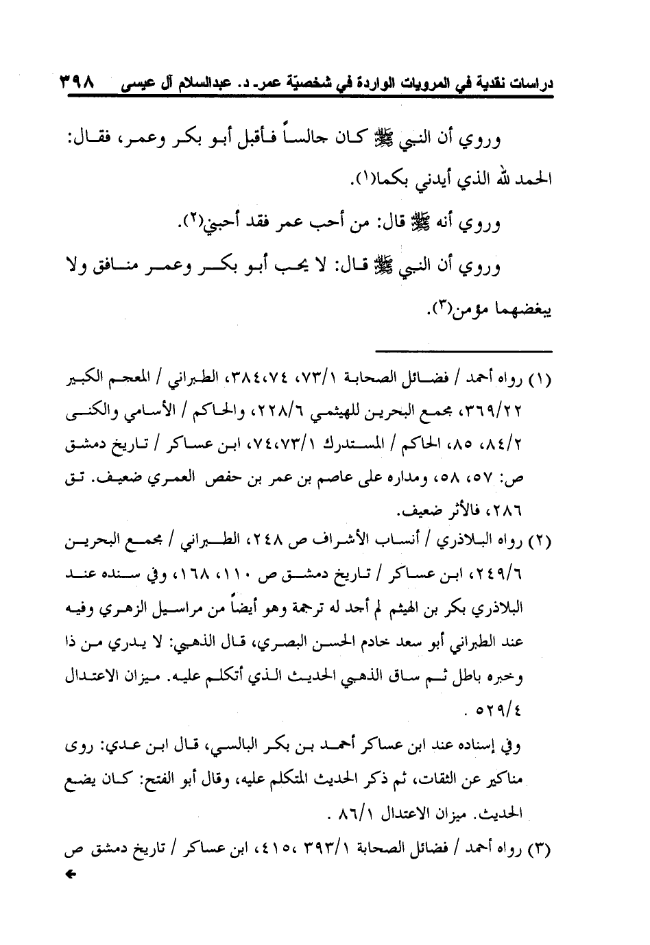 1 رواه أحمد / فضائل الصحابة 1/73، 74،384، الطبراني / المعجم الكبير 22/369، مجمع البحرين للهيثمي 6/228، والحاكم / الأسامي والكنى 2/84، 85، الحاكم / المستدرك 1/73،74، ابن عساكر / تاريخ دمشق ص: 57، 58، ومداره على عاصم بن عمر بن حفص العمري ضعيف. تق 286، فالأثر ضعيف.
