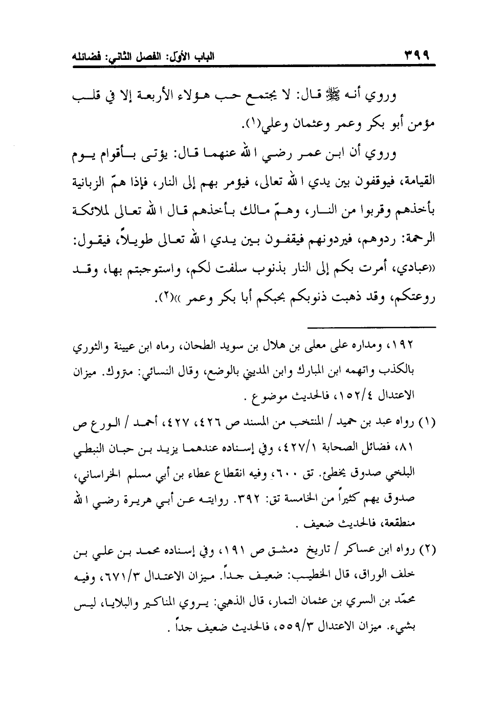 وروي أنه صلى الله عليه وسلم قال: "لا يجتمع حب هؤلاء الأربعة إلا في قلب مؤمن أبو بكر وعمر وعثمان وعلي"1. وروي أن ابن عمر رضي الله عنهما قال: يؤتى بأقوام يوم القيامة، فيوقفون بين يدي الله تعالى، فيؤمر بهم إلى النار، فإذا همّ الزبانية بأخذهم وقربوا من النار، وهمّ مالك بأخذهم قال الله تعالى لملائكة الرحمة: ردوهم، فيردونهم فيقفون بين يدي الله تعالى طويلاً، فيقول: "عبادي، أمرت بكم إلى النار بذنوب سلفت لكم، واستوجبتم بها، وقد روعتكم، وقد ذهبت ذنوبكم بحبكم أبا بكر وعمر"2.