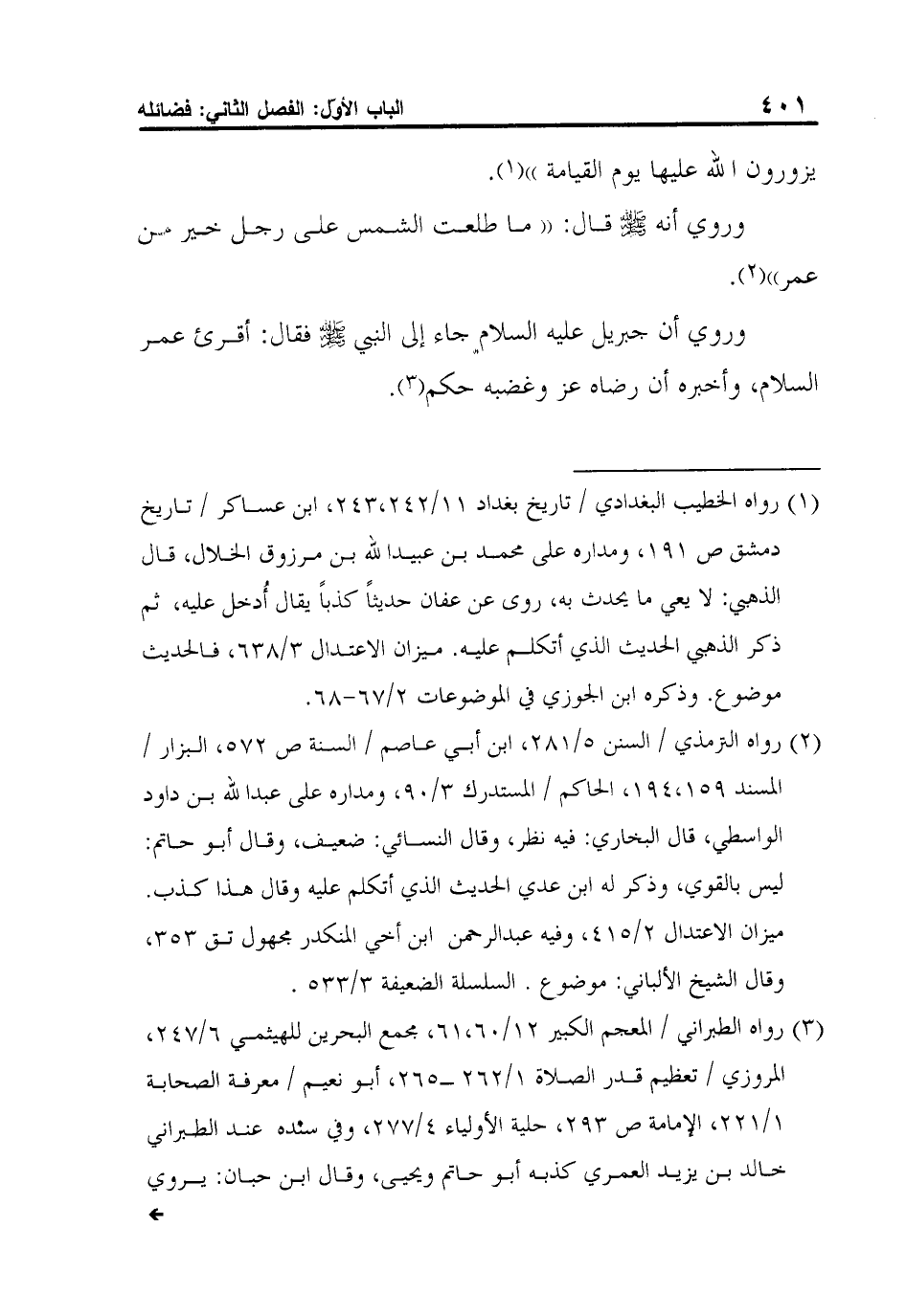 1 رواه الخطيب البغدادي / تاريخ بغداد 11/242،243، ابن عساكر / تاريخ دمشق ص 191، ومداره على محمد بن عبيد الله بن مرزوق الخلال، قال الذهبي: لا يعي ما يحدث به، روى عن عفان حديثاً كذباً يقال أُدخل عليه، ثم ذكر الذهبي الحديث الذي أتكلم عليه. ميزان الاعتدال 3/638، فالحديث موضوع. وذكره ابن الجوزي في الموضوعات 2/67-68.