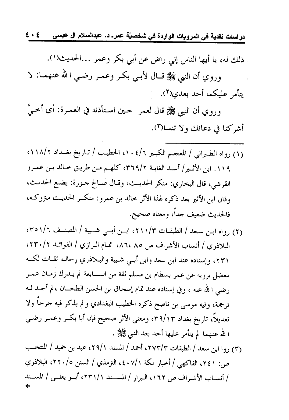1 رواه الطبراني / المعجم الكبير 6/104، الخطيب / تاريخ بغداد 2/118، 119. ابن الأثير/ أسد الغابة 2/369، كلهم من طريق خالد بن عمرو القرشي، قال البخاري: منكر الحديث، وقال صالح جزرة: يضع الحديث، وقال ابن الأثير بعد ذكره لهذا الأثر خالد بن عمرو: منكر الحديث متروكه، فالحديث ضعيف جداً، ومعناه صحيح.