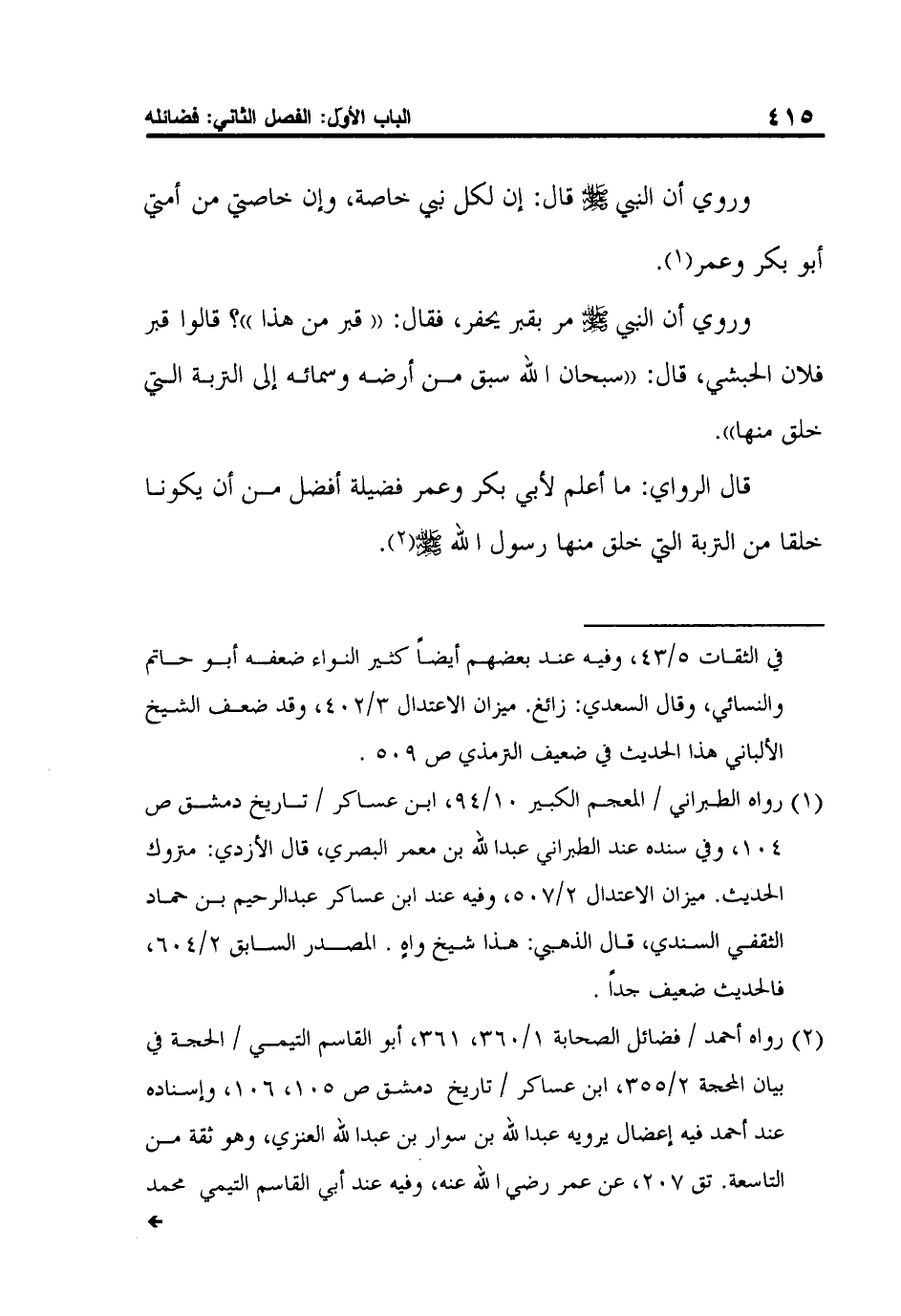 2 رواه أحمد / فضائل الصحابة 1/360، 361، أبو القاسم التيمي / الحجة في بيان المحجة 2/355، ابن عساكر / تاريخ دمشق ص 105، 106، وإسناده عند أحمد فيه إعضال يرويه عبد الله بن سوار بن عبد الله العنزي، وهو ثقة من التاسعة. تق 207، عن عمر رضي الله عنه، وفيه عند أبي القاسم التيمي محمد ابن الحسن النقاش متهم بالكذب والوضع. ميزان الاعتدال 5/380، وفيه عند ابن عساكر أحمد بن الحسن بن أبان متهم بالوضع والكذب. ميزان الاعتدال 1/89، 90، وفيه موسى بن سهل بن هارون الرازي، قال الذهبي: عن أبي إسحاق الأزرق بخبر باطل عن الثوري، عن أبي إسحاق عن أبي الأحوص عن عبد الله مرفوعاً: خلقت أنا وأبو بكر وعمر من تربة واحدة وفيها ندفن. ميزان الاعتدال 4/206، فالحديث موضوع.