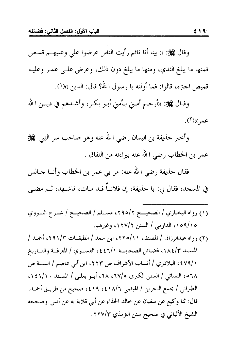 2 رواه عبد الرزاق / المصنف 11/225، ابن سعد / الطبقات 3/291، أحمد / المسند 3/184، فضائل الصحابة 1/446، الفسوي / المعرفة والتاريخ 1/479، البلاذري / أنساب الأشراف ص 223، ابن أبي عاصم / السنة ص 568، النسائي / السنن الكبرى 5/67، 68، أبو يعلى / المسند 10/141، الطبراني / مجمع البحرين / الهيثمي 6/418، 419، صحيح من طريق أحمد. قال: ثنا وكيع عن سفيان عن خالد الحذاء عن أبي قلابة به عن أنس وصححه الشيخ الألباني في صحيح سنن الترمذي 3/227.