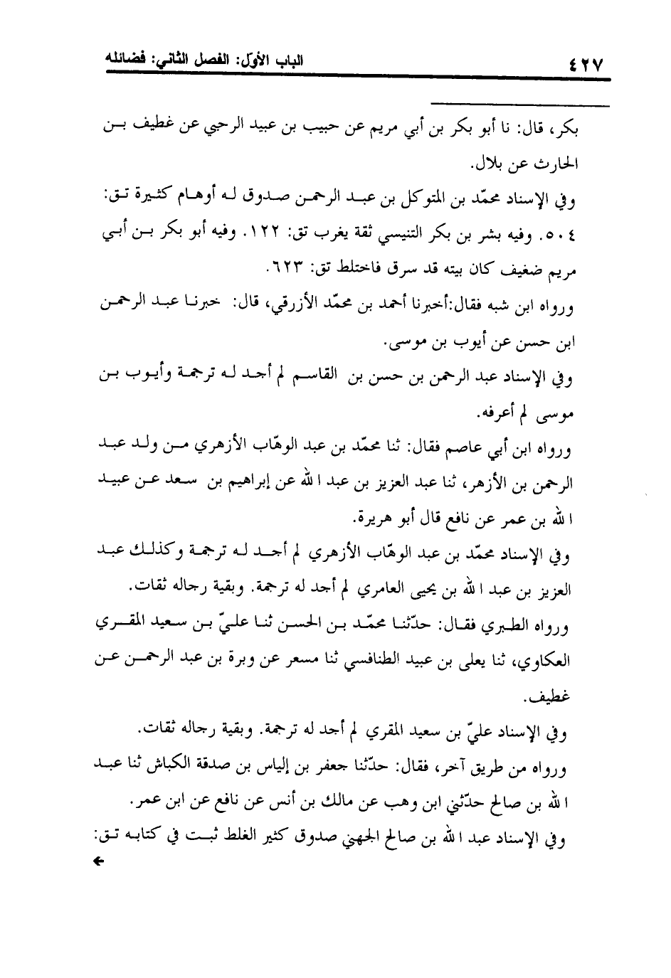 وفي الإسناد محمّد بن عبد الوهّاب الأزهري لم أجد له ترجمة وكذلك عبد العزيز بن عبد الله بن يحيى العامري لم أجد له ترجمة. وبقية رجاله ثقات.