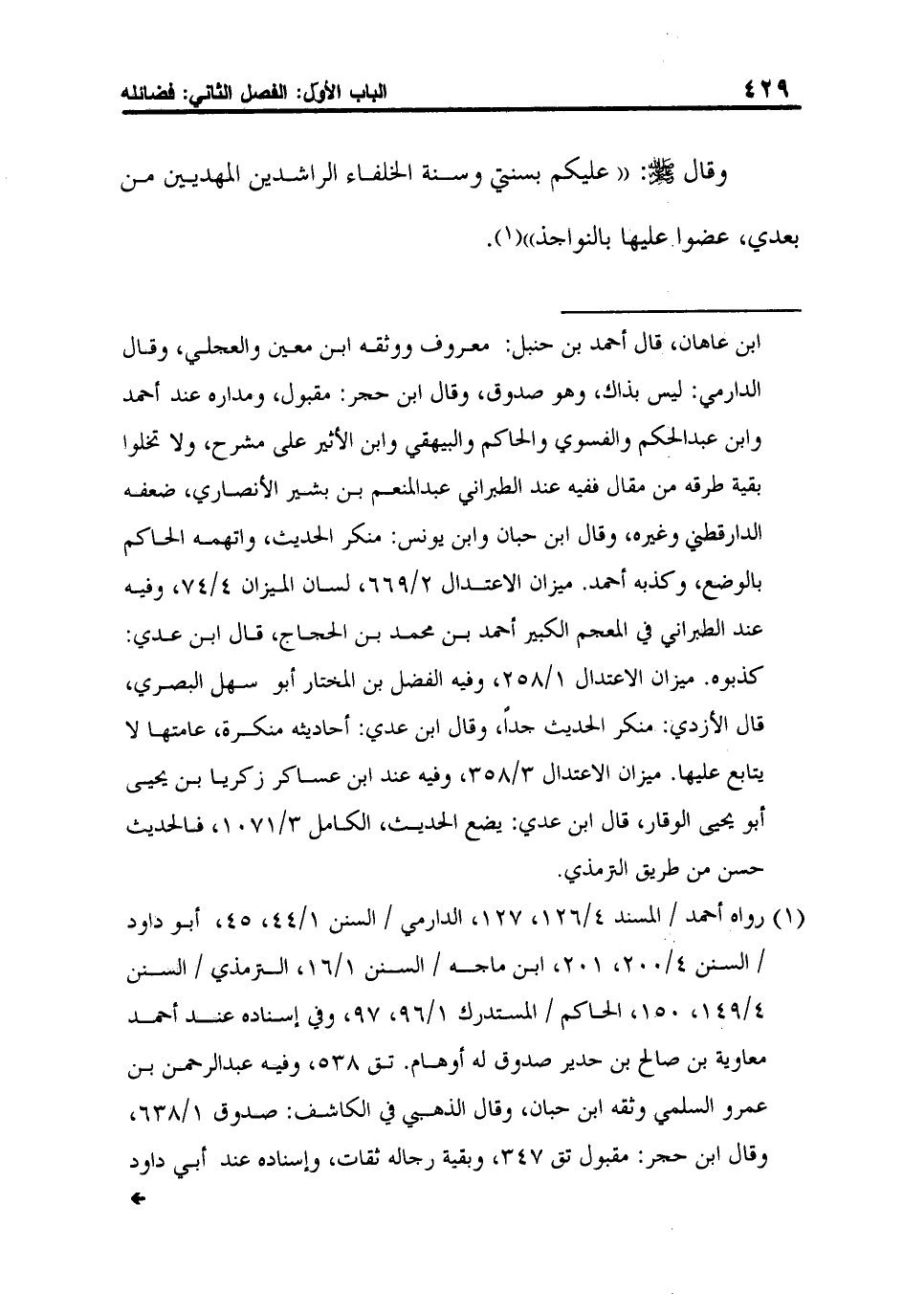 1 رواه أحمد / المسند 4/126، 127، الدارمي / السنن 1/44، 45، أبو داود / السنن 4/200، 201، ابن ماجه / السنن 1/16، الترمذي / السنن 4/149، 150، الحاكم / المستدرك 1/96، 97، وفي إسناده عند أحمد معاوية بن صالح بن حدير صدوق له أوهام. تق 538، وفيه عبد الرحمن بن عمرو السلمي وثقه ابن حبان، وقال الذهبي في الكاشف: صدوق 1/638، وقال ابن حجر: مقبول تق 347، وبقية رجاله ثقات، وإسناده عند أبي داود متصل، ورجاله ثقات سوى عبد الرحمن بن عمرو السلمي المتقدم، وقال تابعه حُجْر بن حُجْر الكلاعي الحمصي، ذكره ابن حبان في الثقات 4/177، ووثقه الحاكم في المستدرك 1/96،97، وقال ابن حجر: مقبول تق 154، فالحديث صحيح، وقال الترمذي: هذا حديث حسن صحيح، وصححه الشيخ الألباني في إرواء الغليل 8/107.