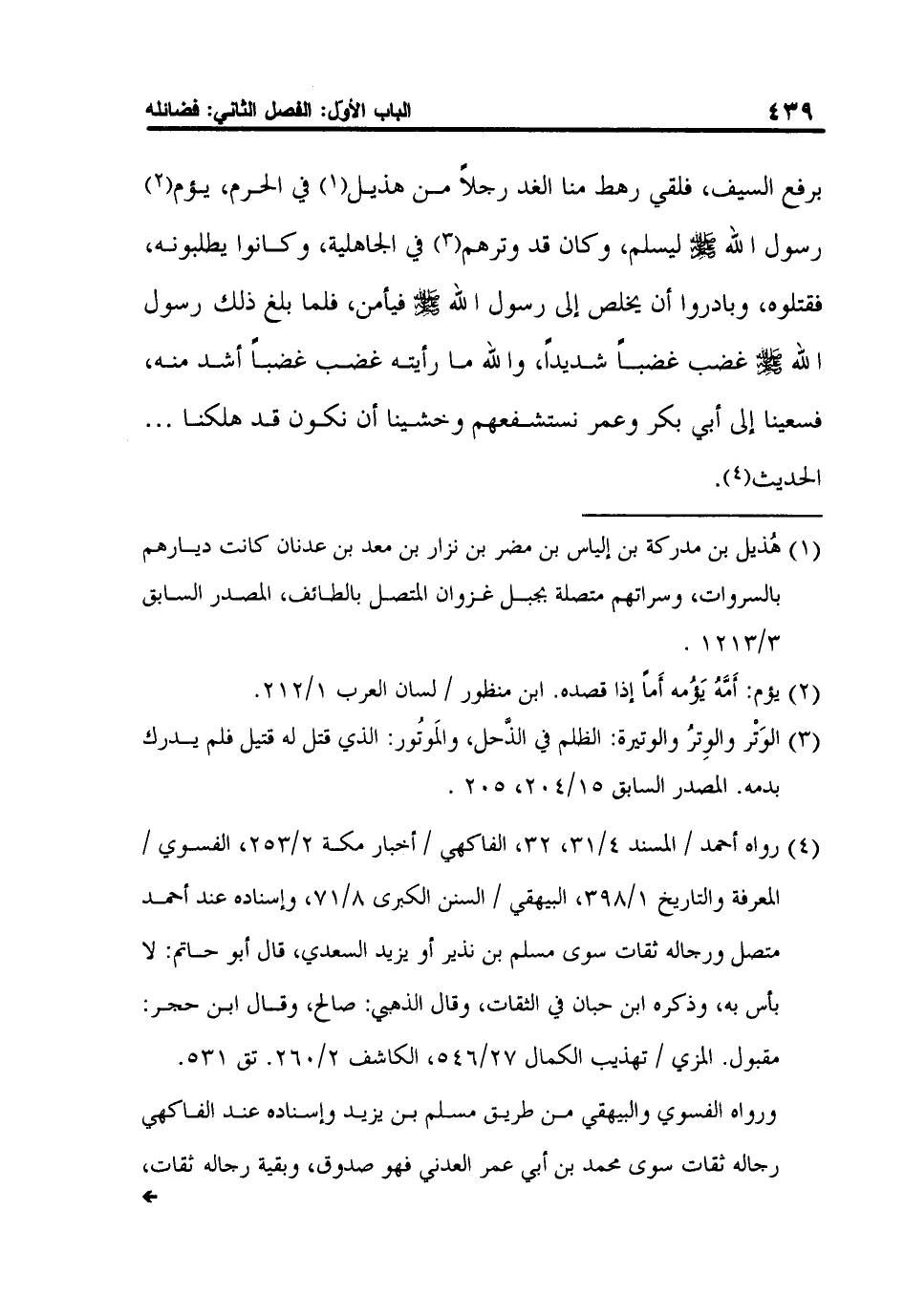 4 رواه أحمد / المسند 4/31، 32، الفاكهي / أخبار مكة 2/253، الفسوي / المعرفة والتاريخ 1/398، البيهقي / السنن الكبرى 8/71، وإسناده عند أحمد متصل ورجاله ثقات سوى مسلم بن نذير أو يزيد السعدي، قال أبو حاتم: لا بأس به، وذكره ابن حبان في الثقات، وقال الذهبي: صالح، وقال ابن حجر: مقبول. المزي / تهذيب الكمال 27/546، الكاشف 2/260. تق 531.