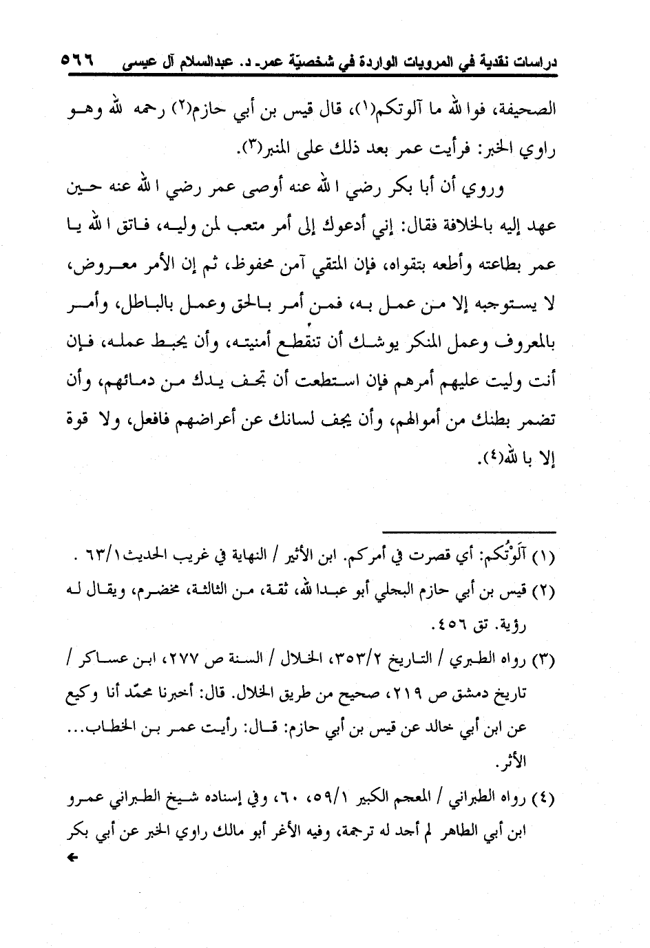 3 رواه الطبري / التاريخ 2/353، الخلال / السنة ص 277، ابن عساكر / تاريخ دمشق ص 219، صحيح من طريق الخلال. قال: أخبرنا محمّد أنا وكيع عن ابن أبي خالد عن قيس بن أبي حازم: قال: رأيت عمر بن الخطاب ... الأثر.