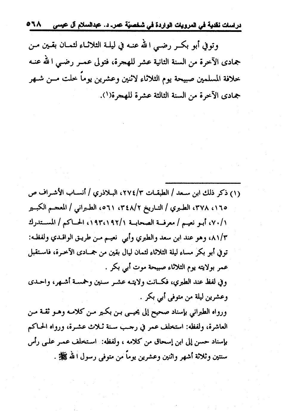 1 ذكر ذلك ابن سعد / الطبقات 3/274، البلاذري / أنساب الأشراف ص 165، 378، الطبري / التاريخ 2/348، 561، الطبراني / المعجم الكبير 1/70، أبو نعيم / معرفة الصحابة 1/192،193، الحاكم / المستدرك 3/81، وهو عند ابن سعد والطبري وأبي نعيم من طريق الواقدي ولفظه: توفي أبو بكر مساء ليلة الثلاثاء لثمان ليال بقين من جمادى الآخرة، فاستقبل عمر بولايته يوم الثلاثاء صبيحة موت أبي بكر.