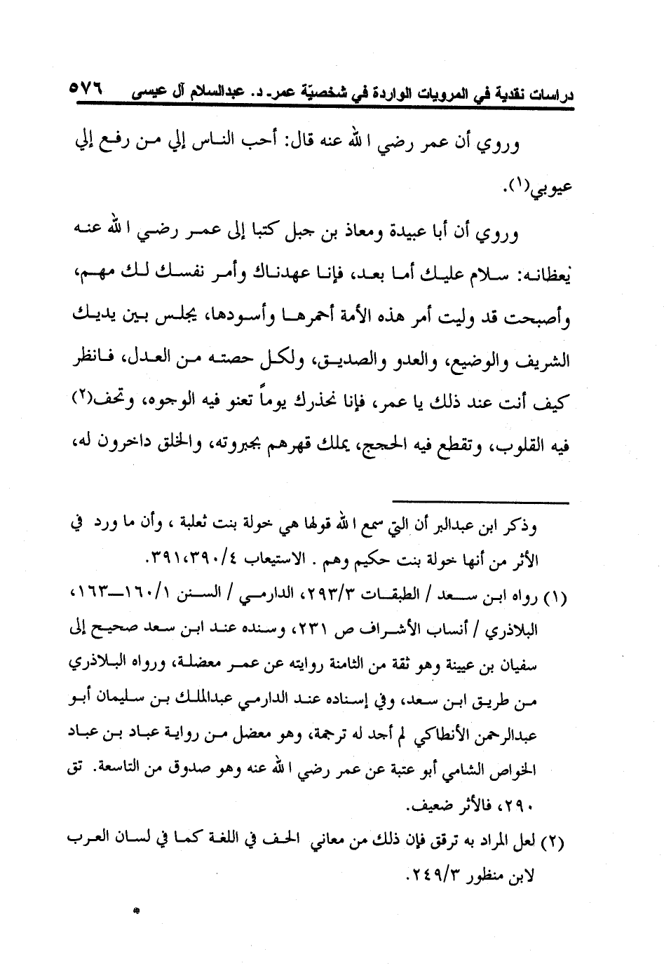 1 رواه ابن سعد / الطبقات 3/293، الدارمي / السنن 1/160-163، البلاذري / أنساب الأشراف ص 231، وسنده عند ابن سعد صحيح إلى سفيان بن عيينة وهو ثقة من الثامنة روايته عن عمر معضلة، ورواه البلاذري من طريق ابن سعد، وفي إسناده عند الدارمي عبد الملك بن سليمان أبو عبد الرحمن الأنطاكي لم أجد له ترجمة، وهو معضل من رواية عباد بن عباد الخواص الشامي أبو عتبة عن عمر رضي الله عنه وهو صدوق من التاسعة. تق 290، فالأثر ضعيف.