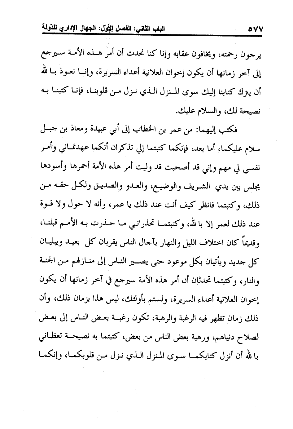 فكتب إليهما: من عمر بن الخطاب إلى أبي عبيدة ومعاذ بن جبل سلام عليكما، أما بعد، فإنكما كتبتما إلي تذكران أنكما عهدتماني وأمر نفسي لي مهم وإني قد أصحبت قد وليت أمر هذه الأمة أحمرها وأسودها يجلس بين يدي الشريف والوضيع، والعدو والصديق ولكل حقه من ذلك، وكتبتما فانظر كيف أنت عند ذلك يا عمر، وأنه لا حول ولا قوة عند ذلك لعمر إلا بالله، وكتبتما تحذراني ما حذرت به الأمم قبلنا، وقديماً كان اختلاف الليل والنهار بآجال الناس يقربان كل بعيد ويبليان كل جديد ويأتيان بكل موعود حتى يصير الناس إلى منازلهم من الجنة والنار، وكتبتما تحدثان أن أمر هذه الأمة سيرجع في آخر زمانها أن يكون إخوان العلانية أعداء السريرة، ولستم بأولئك، ليس هذا بزمان ذلك، وأن ذلك زمان تظهر فيه الرغبة والرهبة، تكون رغبة بعض الناس إلى بعض لصلاح دنياهم، ورهبة بعض الناس من بعض، كتبتما به نصيحة تعظاني بالله أن أنزل كتابكما سوى المنزل الذي نزل من قلوبكما، وإنكما