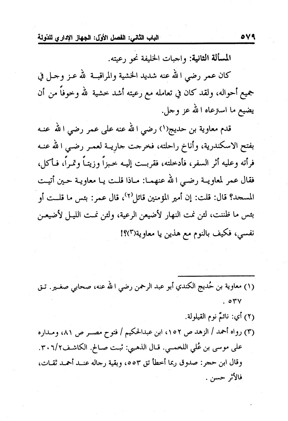 قدم معاوية بن حديج1 رضي الله عنه على عمر رضي الله عنه بفتح الاسكندرية، وأناخ راحلته، فخرجت جارية لعمر رضي الله عنه فرأته وعليه أثر السفر، فأدخلته، فقربت إليه خبزاً وزيتاً وتمراً، فأكل، فقال عمر لمعاوية رضي الله عنهما: ماذا قلت يا معاوية حين أتيت المسجد؟ قال: قلت: إن أمير المؤمنين قائل2، قال عمر: بئس ما قلت أو بئس ما ظننت، لئن نمت النهار لأضيعن الرعية، ولئن نمت الليل لأضيعن نفسي، فكيف بالنوم مع هذين يا معاوية3؟!