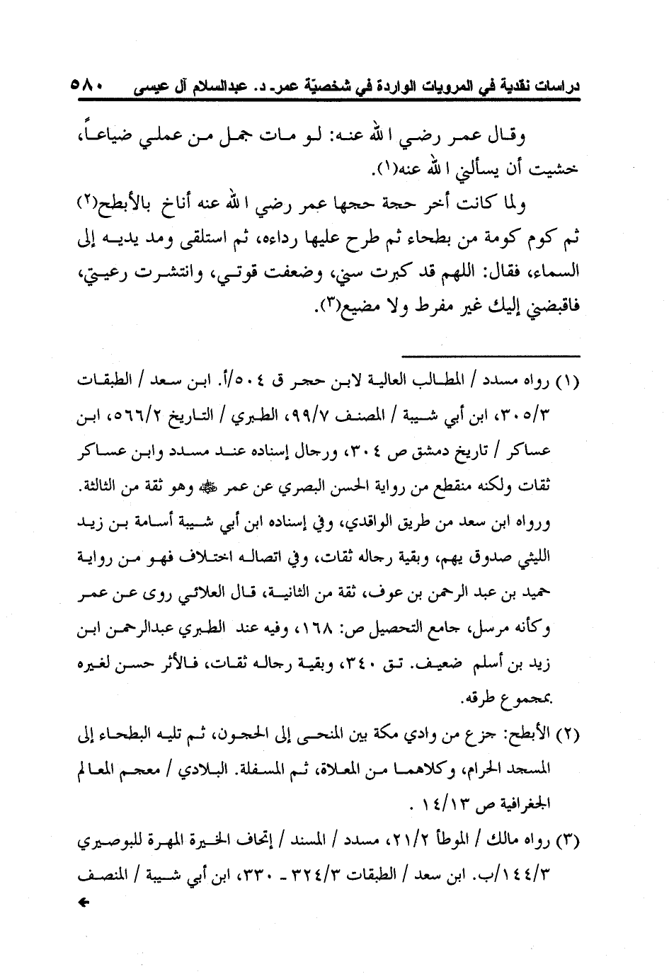 3 رواه مالك / الموطأ 2/21، مسدد / المسند / إتحاف الخيرة المهرة للبوصيري 3/144/ب. ابن سعد / الطبقات 3/324 - 330، ابن أبي شيبة / المنصف 7/96، ابن شبة / تاريخ المدنية 3/90، البلاذري / أنساب الأشراف ص 338، ابن أبي عاصم / الآحاد والمثاني 1/107،109، الحاكم / المستدرك 3/91، 92، ومداره على سعيد بن المسيب وقد اختلف في سماعه من عمر رضي الله عنه وبقية رجاله عند مالك ثقات، ورواه ابن سعد من طريق آخر رجاله ثقات ولكنه منقطع من رواية الحسن البصري عن عمر رضي الله عنه، فالأثر حسن لغيره بطريقيه.
