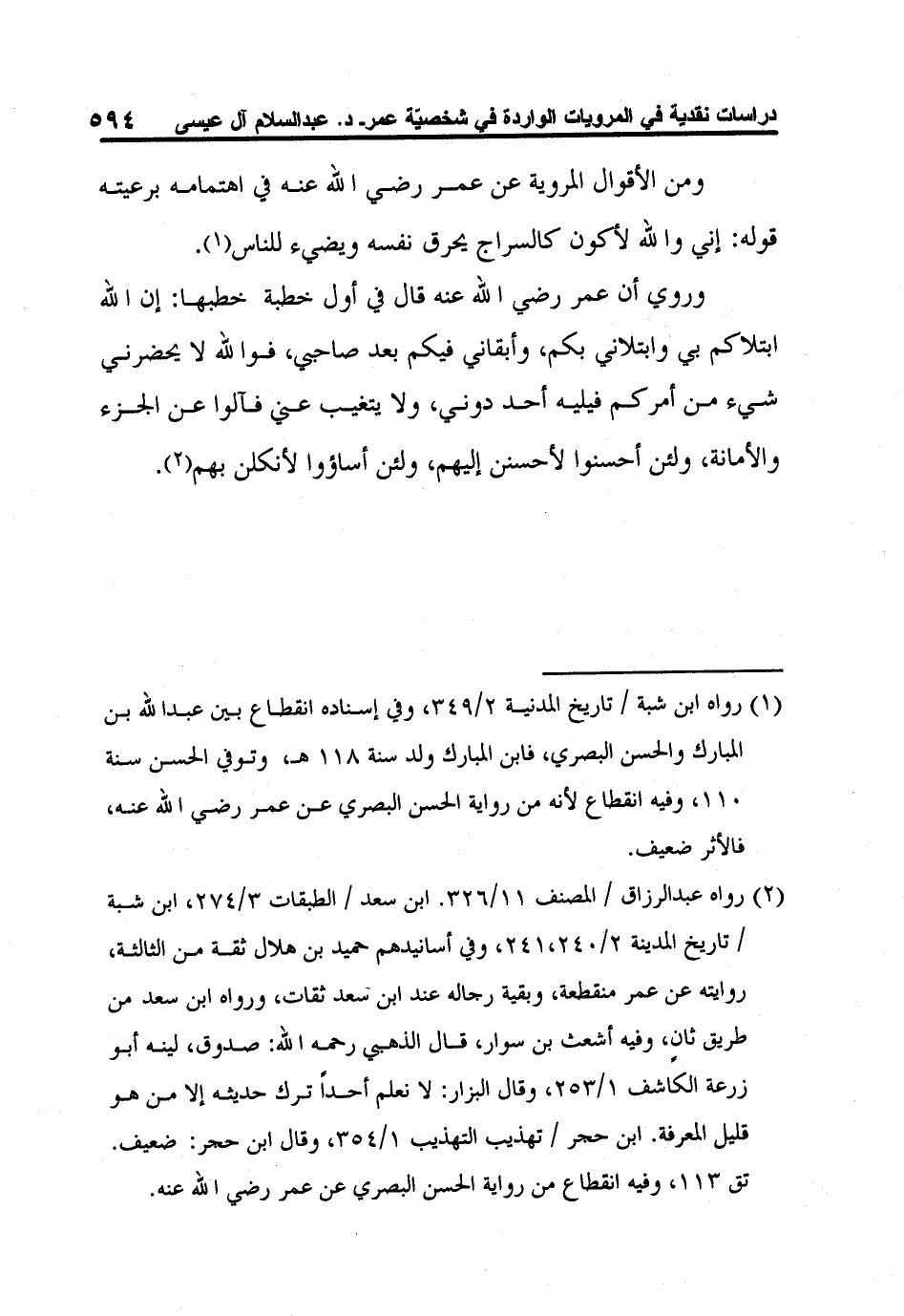 2 رواه عبد الرزاق / المصنف 11/326. ابن سعد / الطبقات 3/274، ابن شبة / تاريخ المدينة 2/240،241، وفي أسانيدهم حميد بن هلال ثقة من الثالثة، روايته عن عمر منقطعة، وبقية رجاله عند ابن سعد ثقات، ورواه ابن سعد من طريق ثانٍ، وفيه أشعث بن سوار، قال الذهبي رحمه الله: صدوق، لينه أبو زرعة الكاشف 1/253، وقال البزار: لا نعلم أحداً ترك حديثه إلا من هو قليل المعرفة. ابن حجر / تهذيب التهذيب 1/354، وقال ابن حجر: ضعيف. تق 113، وفيه انقطاع من رواية الحسن البصري عن عمر رضي الله عنه.