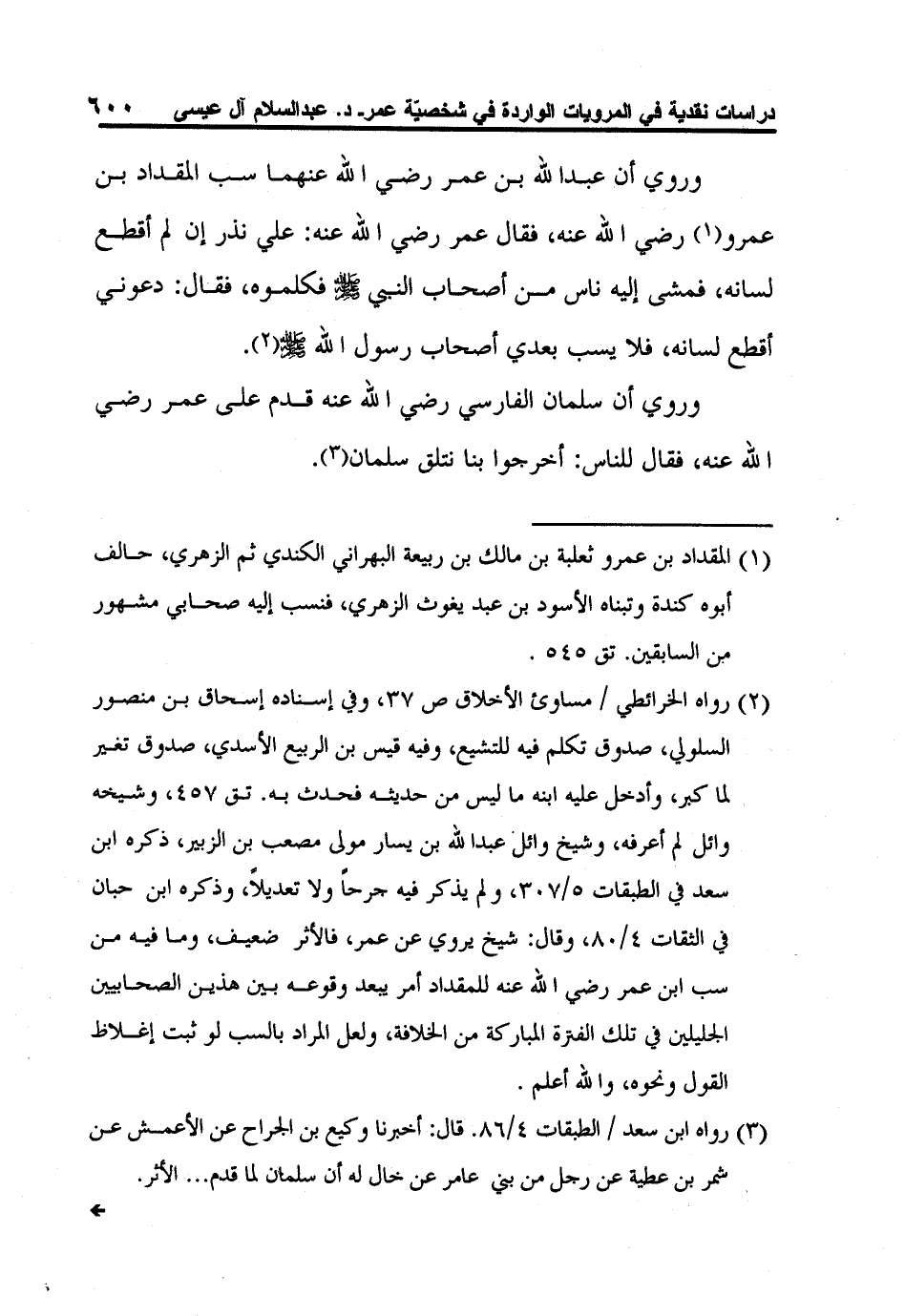 2 رواه الخرائطي / مساوئ الأخلاق ص 37، وفي إسناده إسحاق بن منصور السلولي، صدوق تكلم فيه للتشيع، وفيه قيس بن الربيع الأسدي، صدوق تغير لما كبر، وأدخل عليه ابنه ما ليس من حديثه فحدث به. تق 457، وشيخه وائل لم أعرفه، وشيخ وائل عبد الله بن يسار مولى مصعب بن الزبير، ذكره ابن سعد في الطبقات 5/307، ولم يذكر فيه جرحاً ولا تعديلاً، وذكره ابن حبان في الثقات 4/80، وقال: شيخ يروي عن عمر، فالأثر ضعيف، وما فيه من سب ابن عمر رضي الله عنه للمقداد أمر يبعد وقوعه بين هذين الصحابيين الجليلين في تلك الفترة المباركة من الخلافة، ولعل المراد بالسب لو ثبت إغلاظ القول ونحوه، والله أعلم.