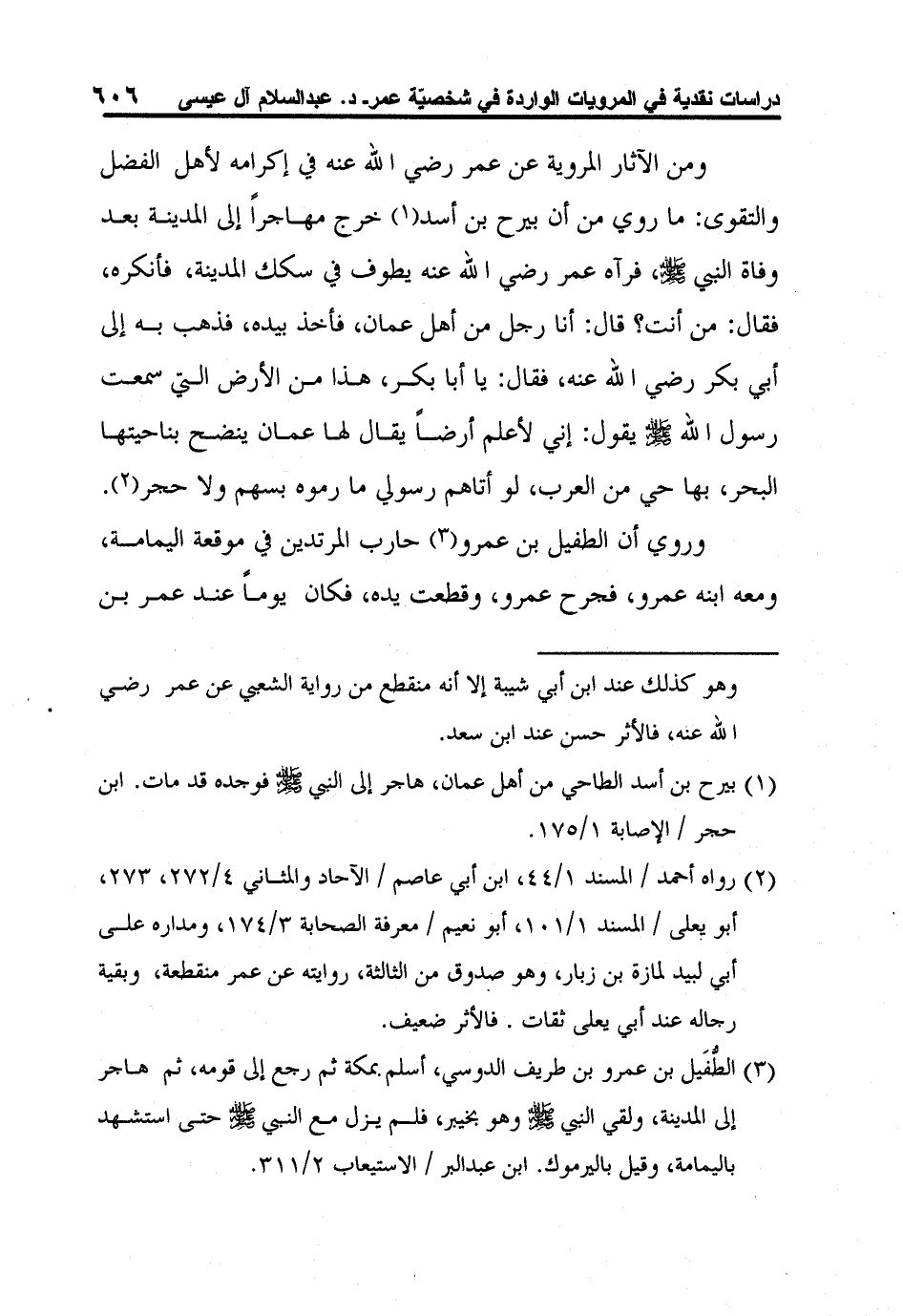 2 رواه أحمد / المسند 1/44، ابن أبي عاصم / الآحاد والمثاني 4/272، 273، أبو يعلى / المسند 1/101، أبو نعيم / معرفة الصحابة 3/174، ومداره على أبي لبيد لمازة بن زبار، وهو صدوق من الثالثة، روايته عن عمر منقطعة، وبقية رجاله عند أبي يعلى ثقات. فالأثر ضعيف.