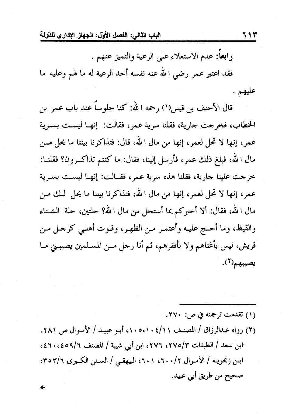 2 رواه عبد الرزاق / المصنف 11/104،105، أبو عبيد / الأموال ص 281. ابن سعد / الطبقات 3/275، 276، ابن أبي شيبة / المصنف 6/459،460، ابن زنجويه / الأموال 2/600، 601، البيهقي / السنن الكبرى 6/353، صحيح من طريق أبي عبيد.