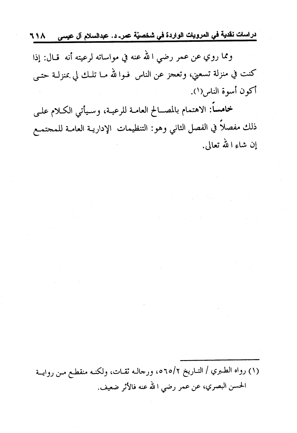 1 رواه الطبري / التاريخ 2/565، ورجاله ثقات، ولكنه منقطع من رواية الحسن البصري، عن عمر رضي الله عنه فالأثر ضعيف.