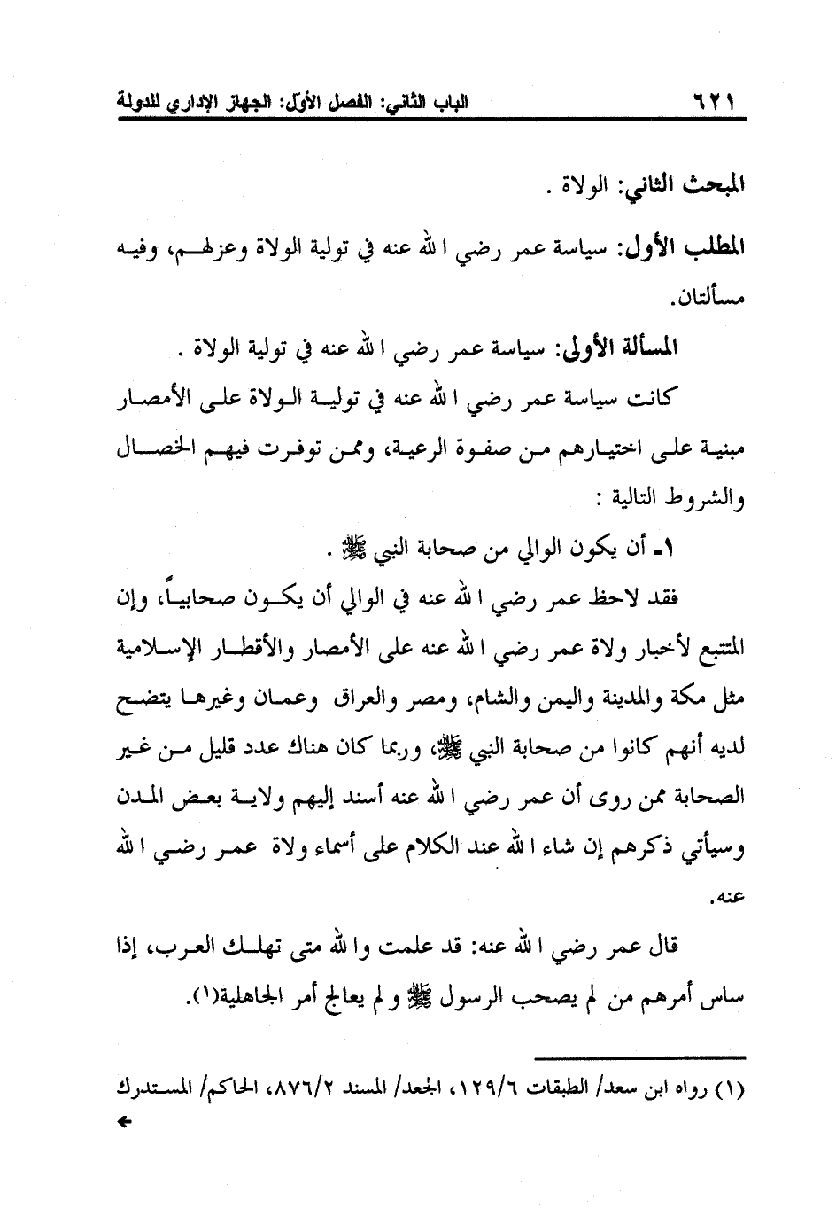 1- أن يكون الوالي من صحابة النبي صلى الله عليه وسلم.