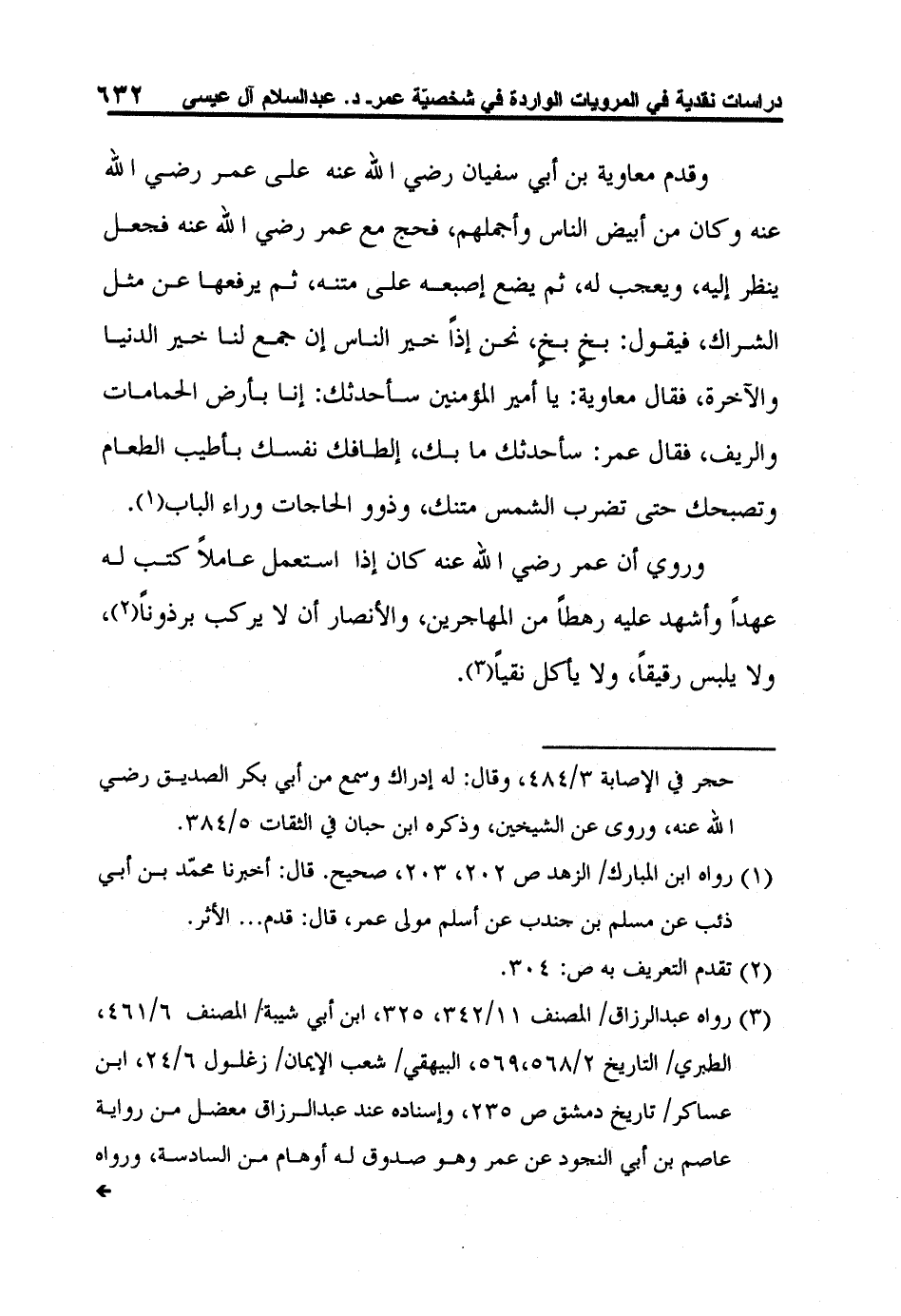3 رواه عبد الرزاق/ المصنف 11/342، 325، ابن أبي شيبة/ المصنف 6/461، الطبري/ التاريخ 2/568،569، البيهقي/ شعب الإيمان/ زغلول 6/24، ابن عساكر/ تاريخ دمشق ص 235، وإسناده عند عبد الرزاق معضل من رواية عاصم بن أبي النجود عن عمر وهو صدوق له أوهام من السادسة، ورواه البيهقي وابن عساكر من طريق عبد الرزاق، ورواه ابن أبي شيبة والطبري من طريق عاصم أيضاً ولكنه يرويه عندهما عن عمارة بن أبي خزيمة ابن ثابت الأنصاري وهو ثقة من الثالثة، وروايته عن عمر منقطعة، فالأثر ضعيف.