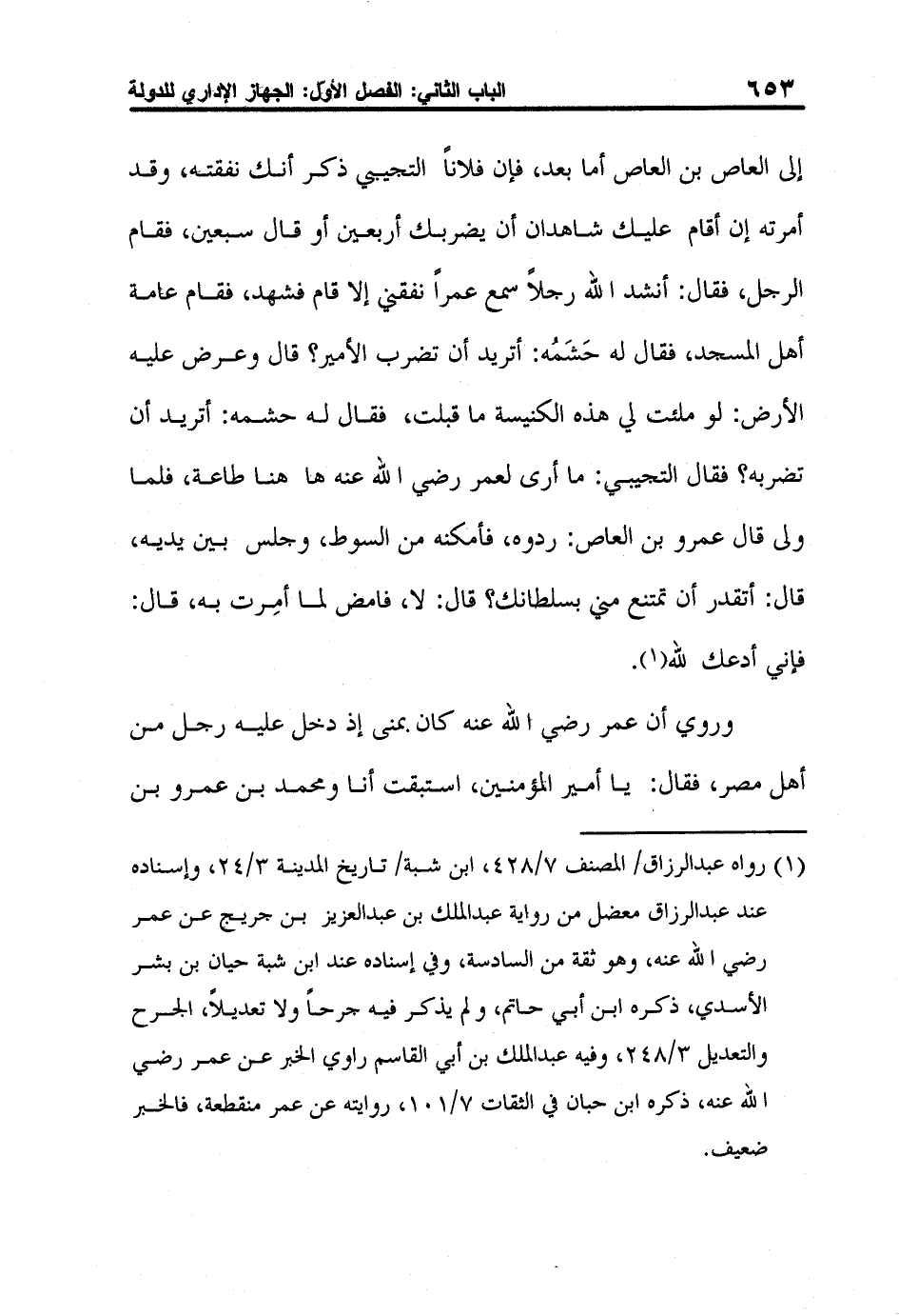 1 رواه عبد الرزاق/ المصنف 7/428، ابن شبة/ تاريخ المدينة 3/24، وإسناده عند عبد الرزاق معضل من رواية عبد الملك بن عبد العزيز بن جريج عن عمر رضي الله عنه، وهو ثقة من السادسة، وفي إسناده عند ابن شبة حيان بن بشر الأسدي، ذكره ابن أبي حاتم، ولم يذكر فيه جرحاً ولا تعديلاً، الجرح والتعديل 3/248، وفيه عبد الملك بن أبي القاسم راوي الخبر عن عمر رضي الله عنه، ذكره ابن حبان في الثقات 7/101، روايته عن عمر منقطعة، فالخبر ضعيف.