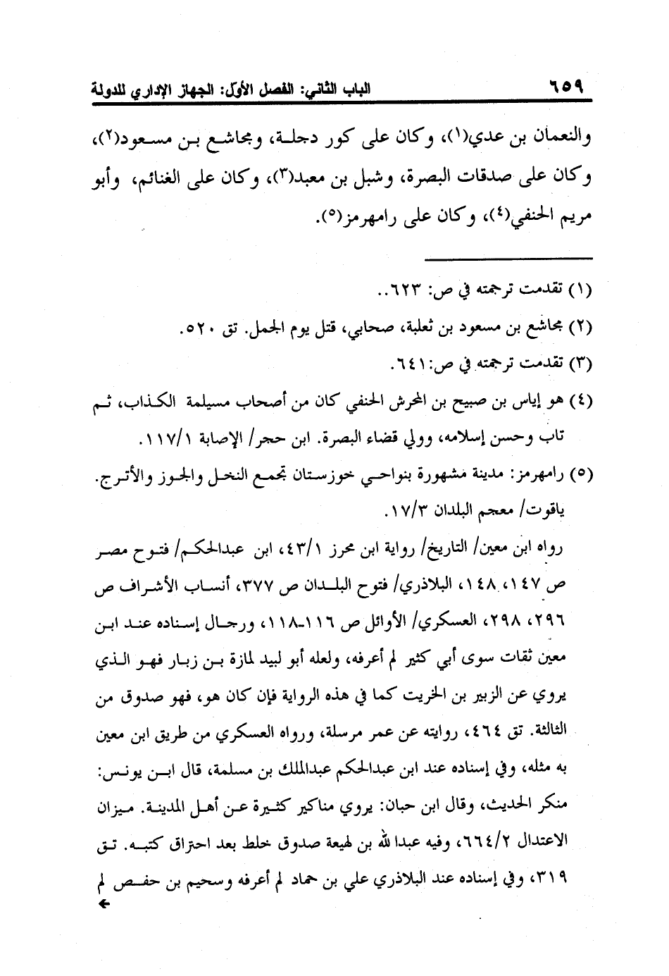 والنعمان بن عدي1، وكان على كور دجلة، ومجاشع بن مسعود2، وكان على صدقات البصرة، وشبل بن معبد 3، وكان على الغنائم، وأبو مريم الحنفي4، وكان على رامهرمز5.