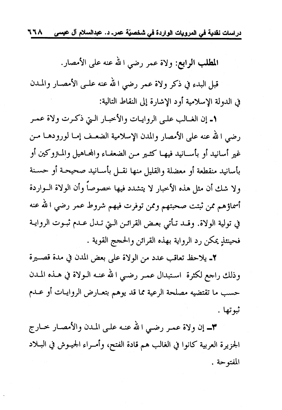 3- إن ولاة عمر رضي الله عنه على المدن والأمصار خارج الجزيرة العربية كانوا في الغالب هم قادة الفتح، وأمراء الجيوش في البلاد المفتوحة.