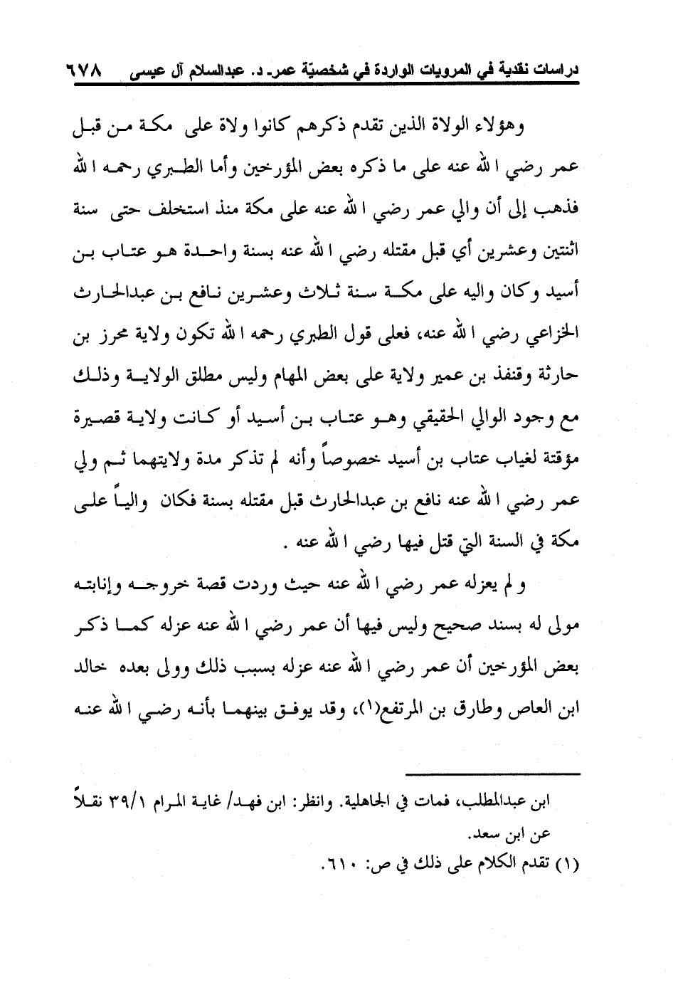 وهؤلاء الولاة الذين تقدم ذكرهم كانوا ولاة على مكة من قبل عمر رضي الله عنه على ما ذكره بعض المؤرخين وأما الطبري رحمه الله فذهب إلى أن والي عمر رضي الله عنه على مكة منذ استخلف حتى سنة اثنتين وعشرين أي قبل مقتله رضي الله عنه بسنة واحدة هو عتاب بن أسيد وكان واليه على مكة سنة ثلاث وعشرين نافع بن عبد الحارث الخزاعي رضي الله عنه، فعلى قول الطبري رحمه الله تكون ولاية محرز بن حارثة وقنفذ بن عمير ولاية على بعض المهام وليس مطلق الولاية وذلك مع وجود الوالي الحقيقي وهو عتاب بن أسيد أو كانت ولاية قصيرة مؤقتة لغياب عتاب بن أسيد خصوصاً وأنه لم تذكر مدة ولايتهما ثم ولي عمر رضي الله عنه نافع بن عبد الحارث قبل مقتله بسنة فكان والياً على مكة في السنة التي قتل فيها رضي الله عنه.