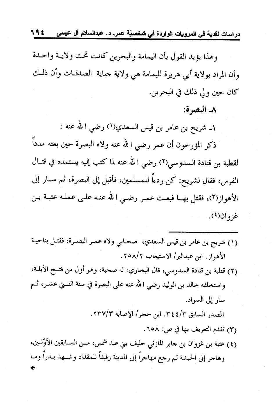 4 عتبة بن غزوان بن جابر المازني حليف بني عبد شمس، من السابقين الأوّلين، وهاجر إلى الحبشة ثم رجع مهاجراً إلى المدينة رفيقاً للمقداد وشهد بدراً وما بعدها. وولاه عمر في الفتوح فاختط البصرة وفتح فتوحاً، وكان طويلاً جميلاً. ابن حجر/ الإصابة 2/455.