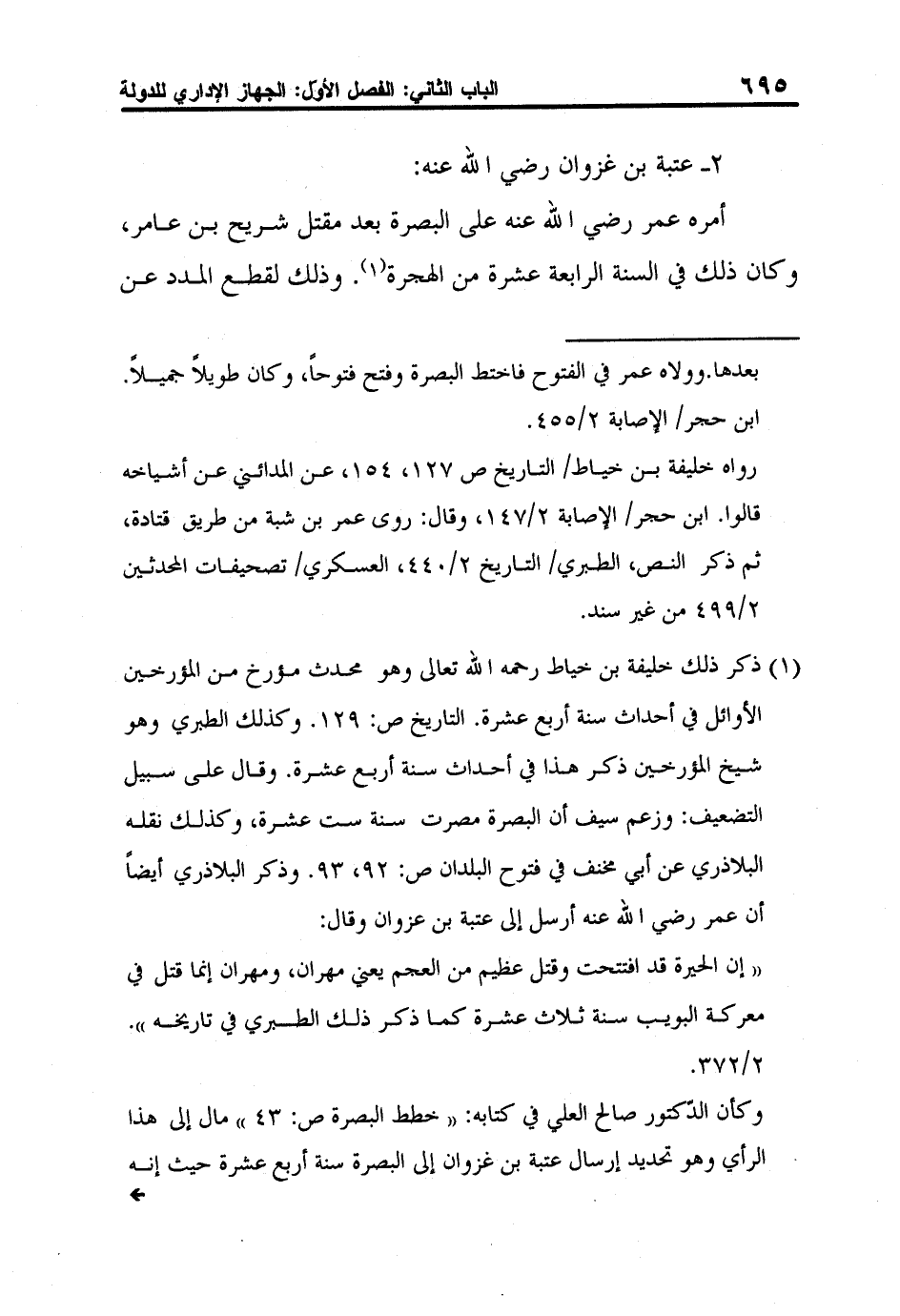 1 ذكر ذلك خليفة بن خياط رحمه الله تعالى وهو محدث مؤرخ من المؤرخين الأوائل في أحداث سنة أربع عشرة. التاريخ ص: 129. وكذلك الطبري وهو شيخ المؤرخين ذكر هذا في أحداث سنة أربع عشرة. وقال على سبيل التضعيف: وزعم سيف أن البصرة مصرت سنة ست عشرة، وكذلك نقله البلاذري عن أبي مخنف في فتوح البلدان ص: 92، 93. وذكر البلاذري أيضاً أن عمر رضي الله عنه أرسل إلى عتبة بن عزوان وقال: